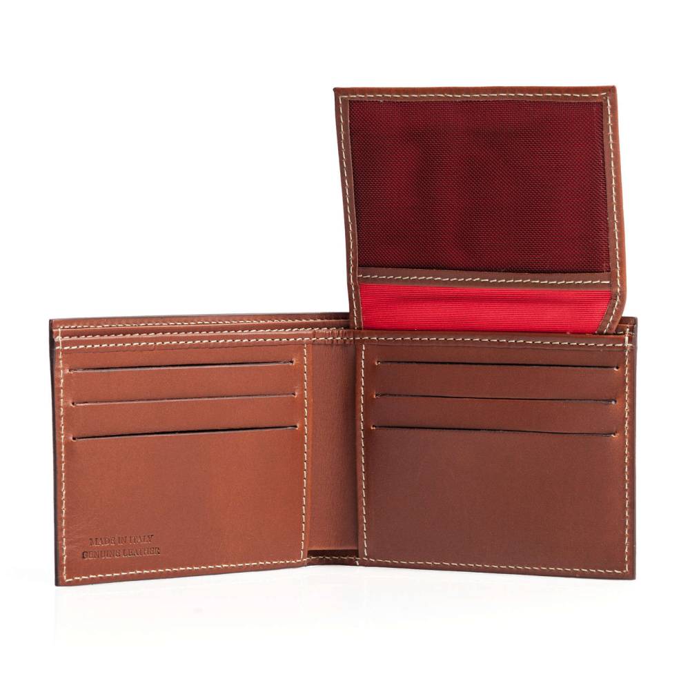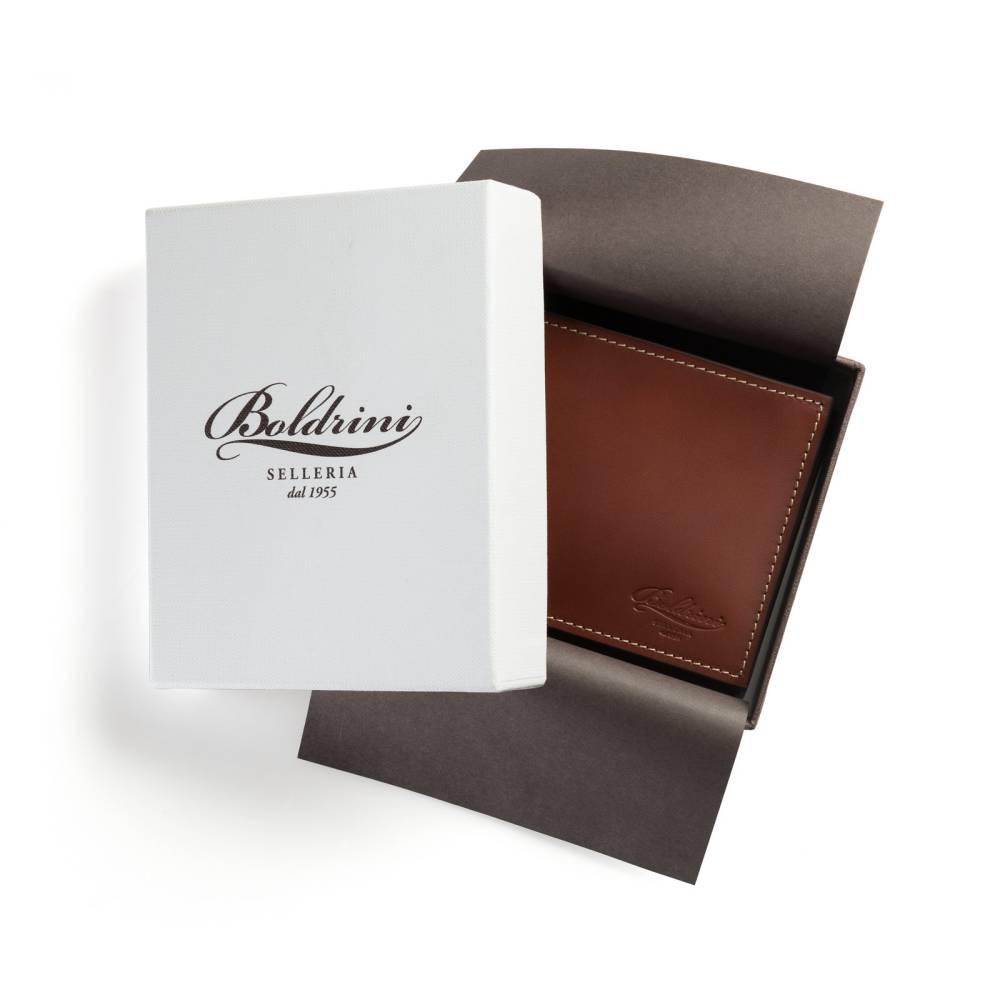 Портмоне Boldrini Selleria из гладкой телячьей кожи коричневого цвета. Модель с восьмью отделениями для банковских карт и визиток, двумя внутренними отсеками, сетчатым холдером для автомобильных прав и двумя отделениями для купюр. Внутри подкладка из плотного ярко-красного текстиля. Внешняя сторона декорирована тиснением в виде логотипа бренда.