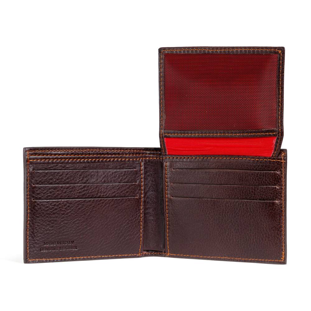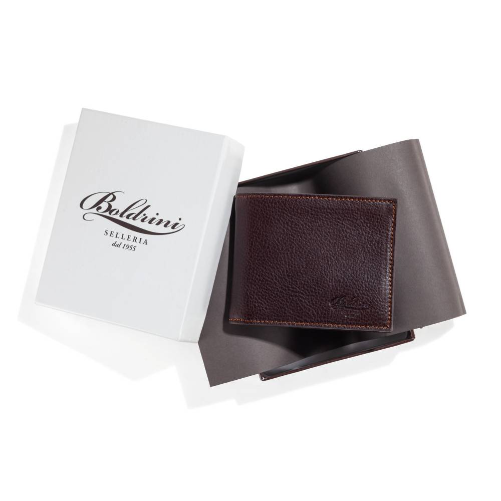 Портмоне Boldrini Selleria из фактурной телячьей кожи тёмно-коричневого цвета. Модель с восьмью отделениями для банковских карт и визиток, двумя внутренними отсеками, сетчатым холдером для автомобильных прав и двумя отделениями для купюр. Внутри подкладка из плотного ярко-красного текстиля. Внешняя сторона декорирована тиснением в виде логотипа бренда.