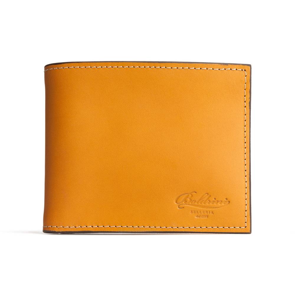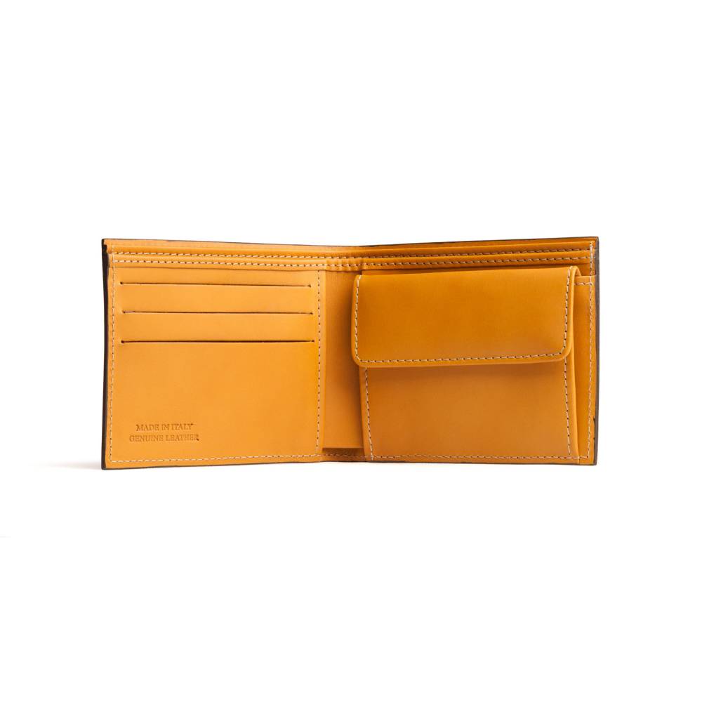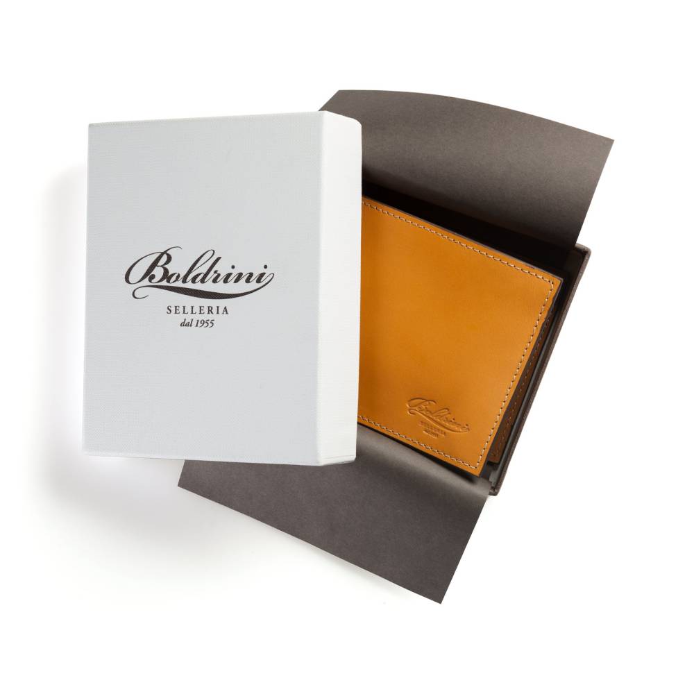 Портмоне Boldrini Selleria из гладкой телячьей кожи горчичного цвета с контрастной строчкой. Модель с тремя отделениями для банковских карт, тремя внутренними отсеками, карманом для монет на кнопке и двумя отделениями для купюр. Внутри подкладка из плотного ярко-красного текстиля. Внешняя сторона декорирована тиснением в виде логотипа бренда. Портмоне поставляется в фирменной картонной коробке.
