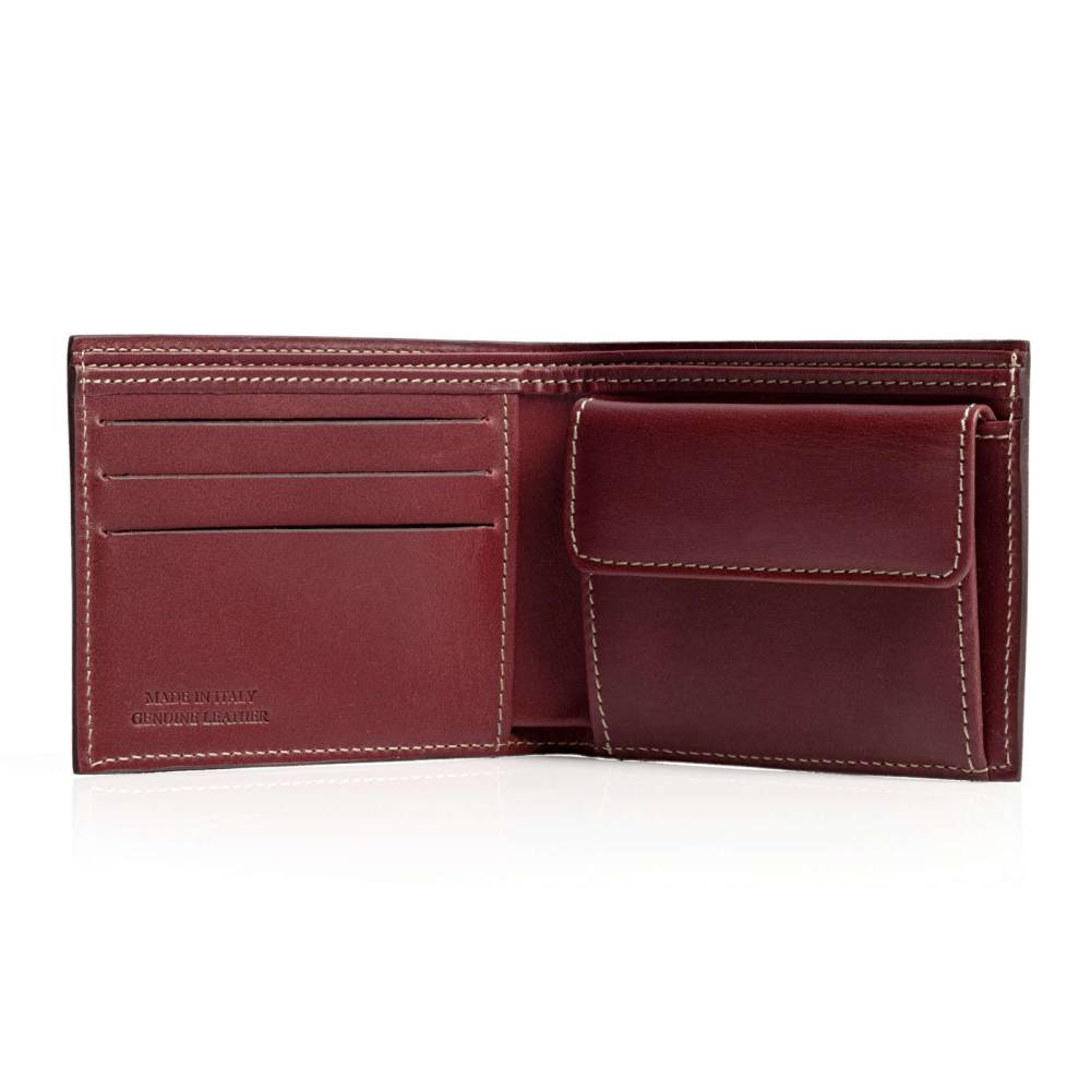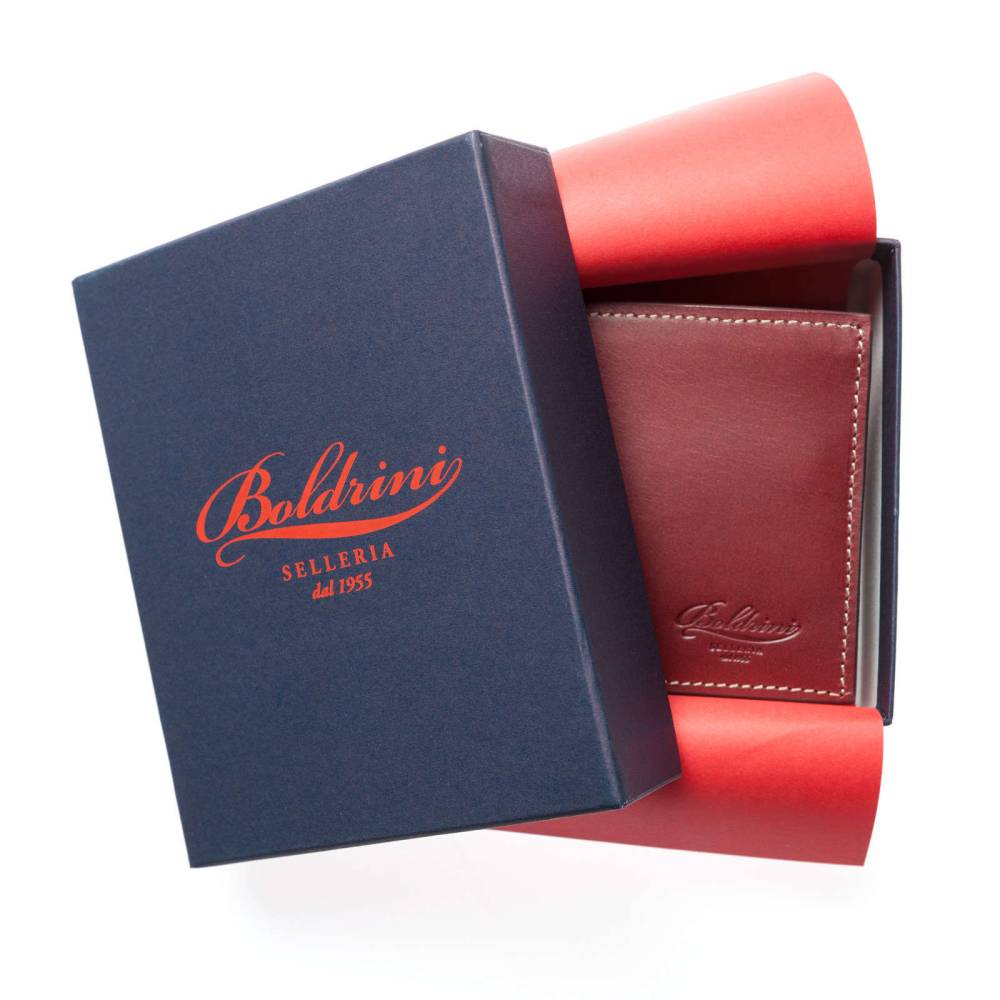Портмоне Boldrini Selleria из гладкой телячьей кожи винного оттенка с контрастной строчкой. Модель с тремя отделениями для банковских карт, тремя внутренними отсеками, карманом для монет на кнопке и двумя отделениями для купюр. Внутри подкладка из плотного ярко-красного текстиля. Внешняя сторона декорирована тиснением в виде логотипа бренда. Портмоне поставляется в фирменной картонной коробке.