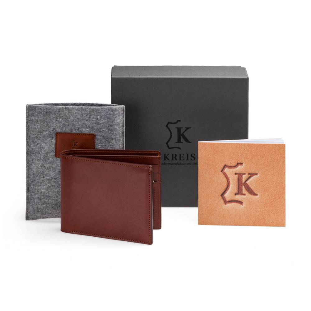 Респектабельное мужское портмоне от немецкой фирмы Kreis Ledermanufaktur из седельной кожи высочайшего класса. Аксессуар выполнен вручную руками лучших кожевенных мастеров. Дизайн модели и её функциональные особенности были разработаны сотрудниками бутика Checkroom. Например: высота портмоне позволяет удобно переносить купюры eвро, вся внутренняя отделка исключительно из натуральной кожи, удобный сетчатый карман для вод. удостоверения, отделение для купюр разделено на две части. Внутри также имеются 8 карманов для банковских карт и визиток. Штучный экземпляр.