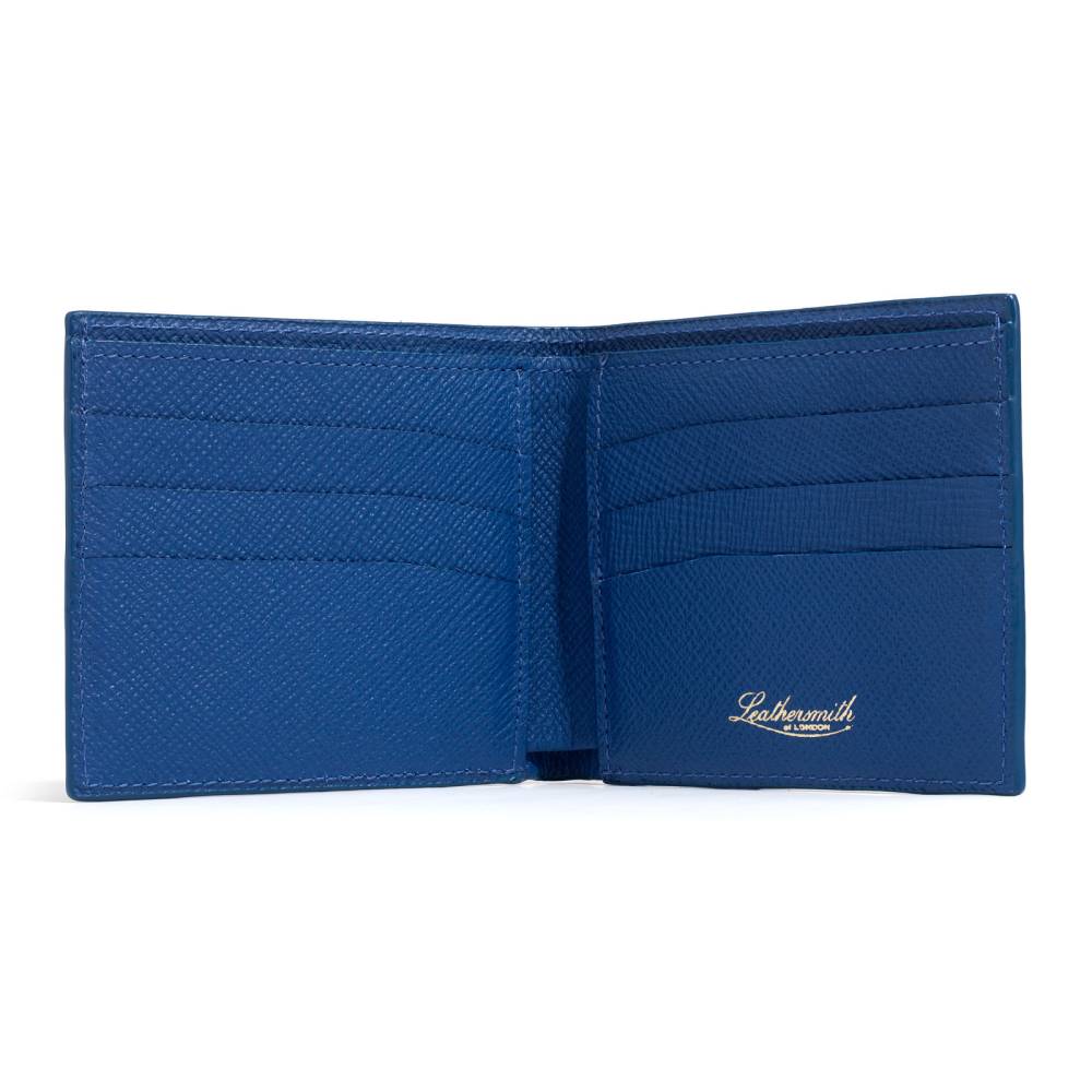 Роскошное портмоне от английской мануфактуры Leathersmith of London. Оно изготовлено вручную из высококачественной зернистой телячьей кожи Rutland насыщенного синего цвета. Внутри — мягкая хлопковая подкладка и продуманное внутреннее пространство: шесть карманов для кредитных карт и удобный центральный отсек для купюр.