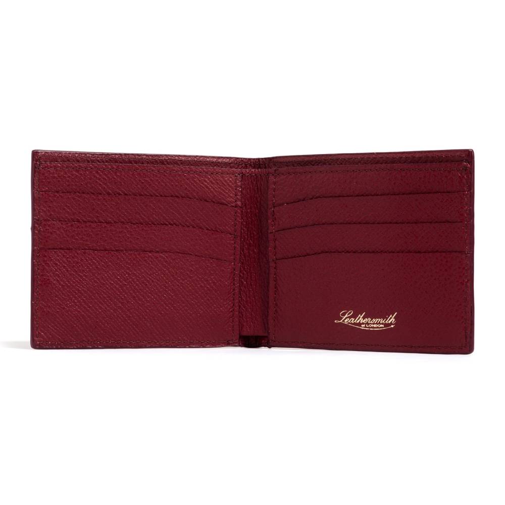 Роскошное портмоне от английской мануфактуры Leathersmith of London. Оно изготовлено вручную из высококачественной зернистой телячьей кожи Rutland насыщенного бордового цвета. Внутри — мягкая хлопковая подкладка и продуманное внутреннее пространство: шесть карманов для кредитных карт и удобный центральный отсек для купюр.