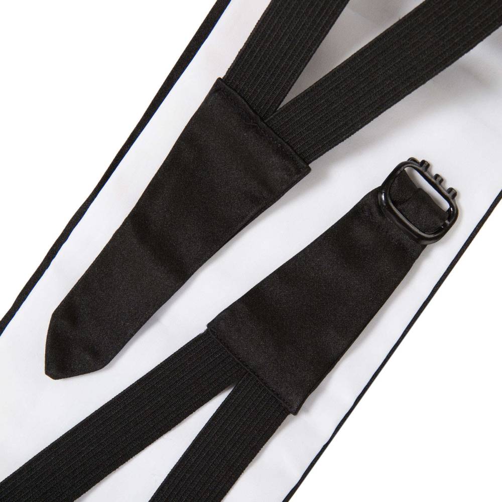 Неотъемлемый аксессуар, без которого смокинг будет не полон – это камербанд. Надевается он исключительно на торжественные мероприятия и церемонии. Аксессуар создан вручную на небольшой итальянской фабрике семейного бренда Petronius в Милане. В производстве использовался чёрный блестящий шёлк наивысшего качества. Модель имеет традиционные складки, заложенные наверх. Подкладка из белой хлопковой ткани.
