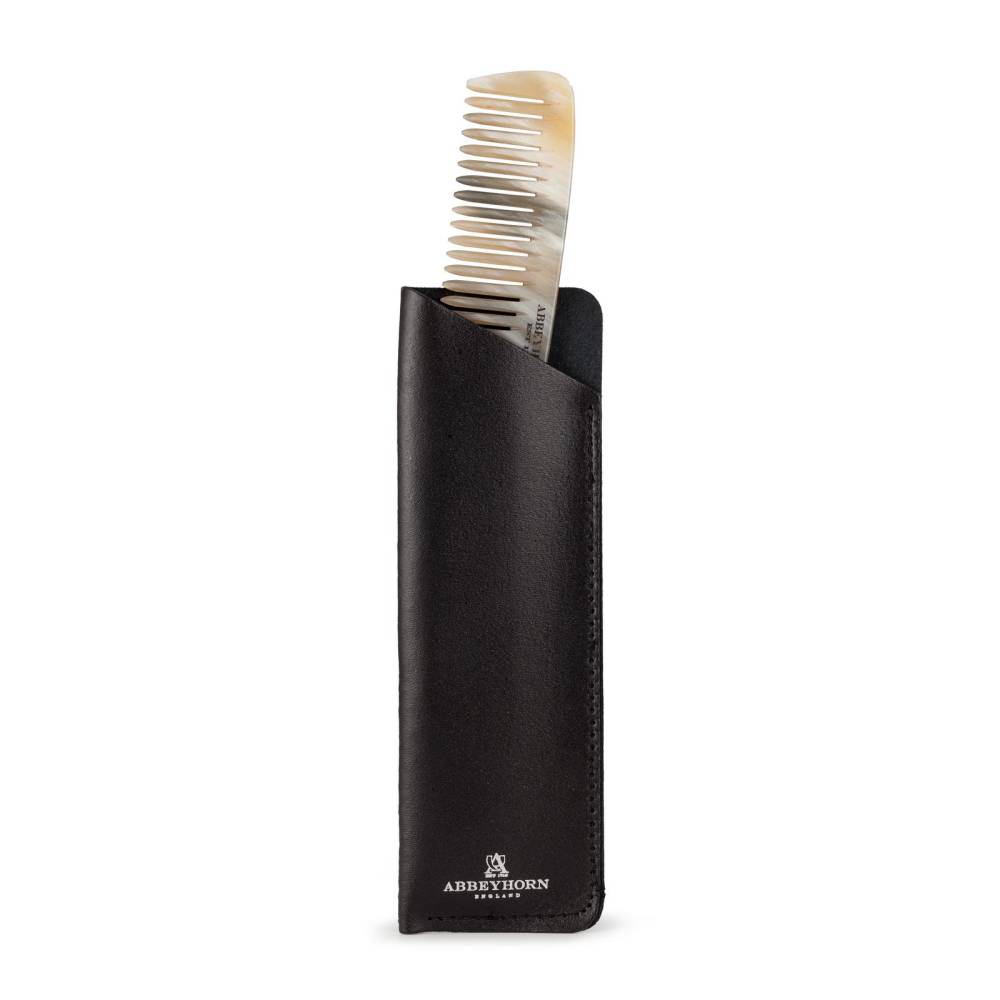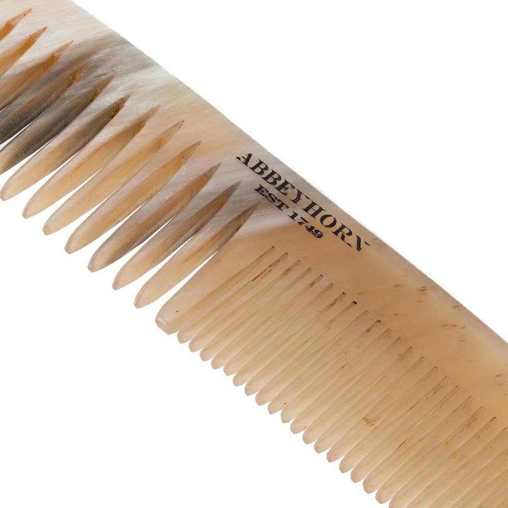 Карманная расчёска Abbeyhorn с двумя типами зубцов. Модель выполнена из цельного куска обработанного бычьего рога бежевого оттенка. Аксессуар представлен в комплекте с чехлом из натуральной кожи.