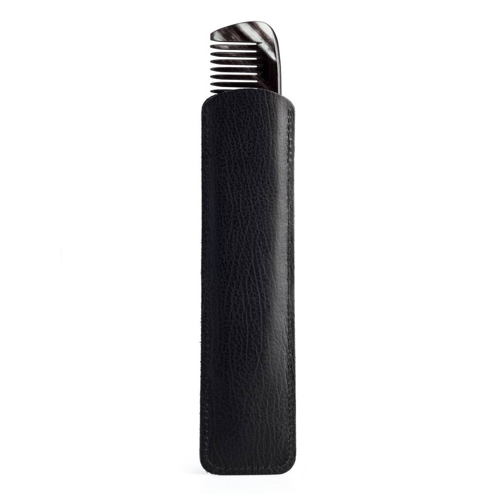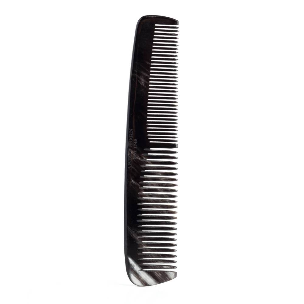 Коллекционная расчёска Abbeyhorn с двумя типами зубцов. Модель выполнена из цельного куска обработанного бычьего рога чёрного цвета. Такой оттенок рога встречается достаточно редко и обладает особым благородным узором. Аксессуар представлен в комплекте с чехлом из натуральной кожи.