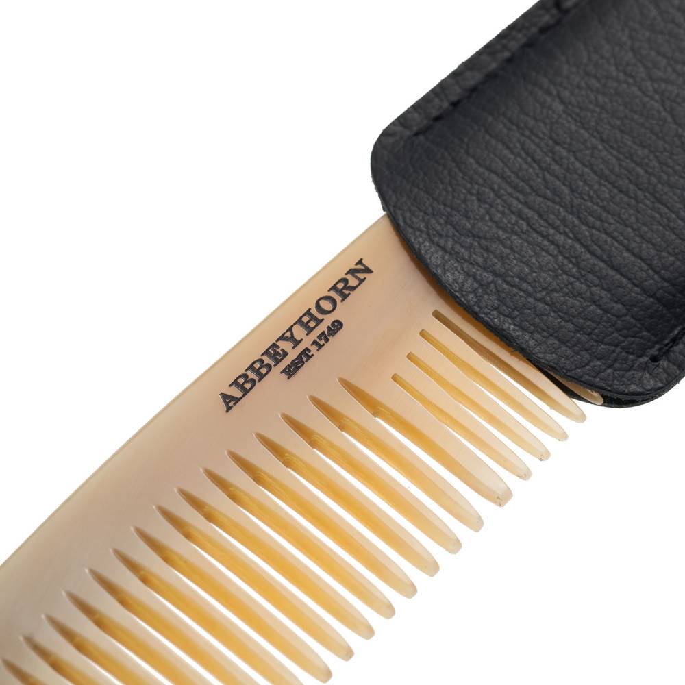 Коллекционная расчёска Abbeyhorn с двумя типами зубцов. Модель выполнена из цельного куска обработанного бычьего рога бежевого оттенка. Аксессуар представлен в комплекте с чехлом из натуральной кожи.