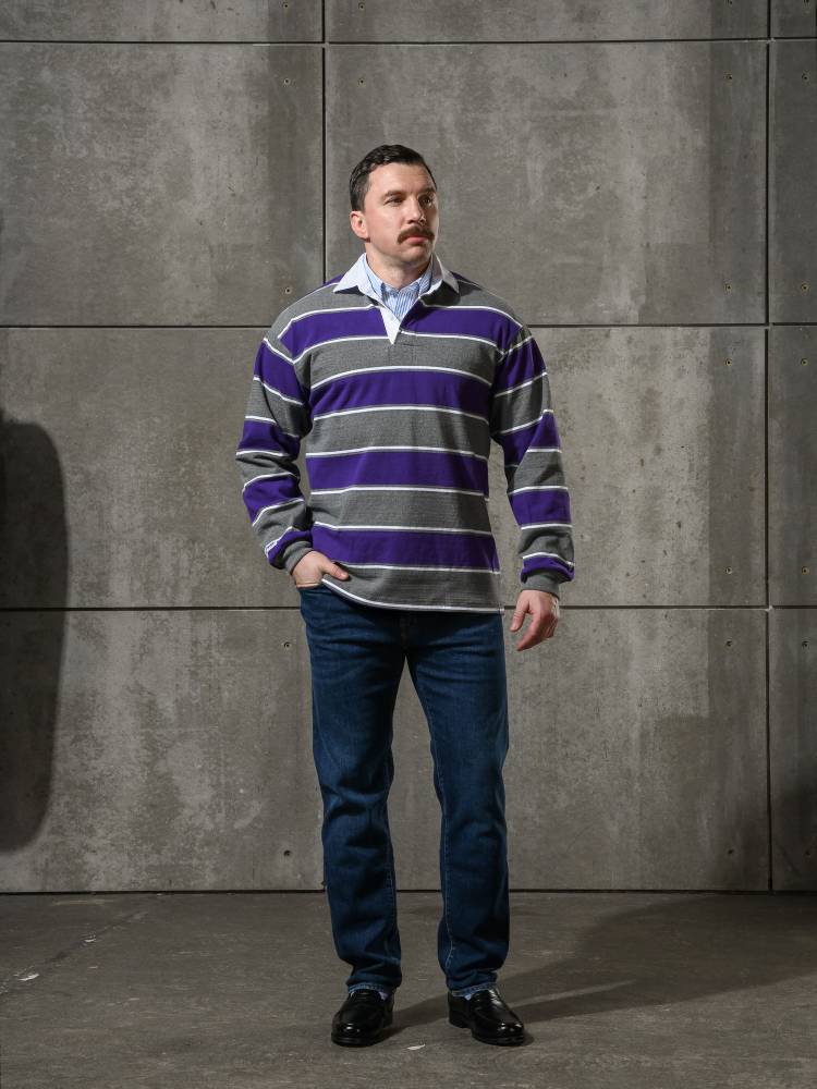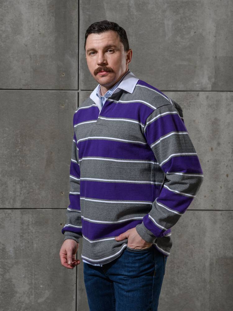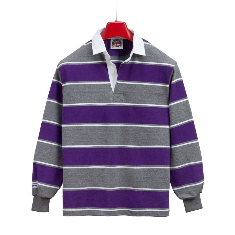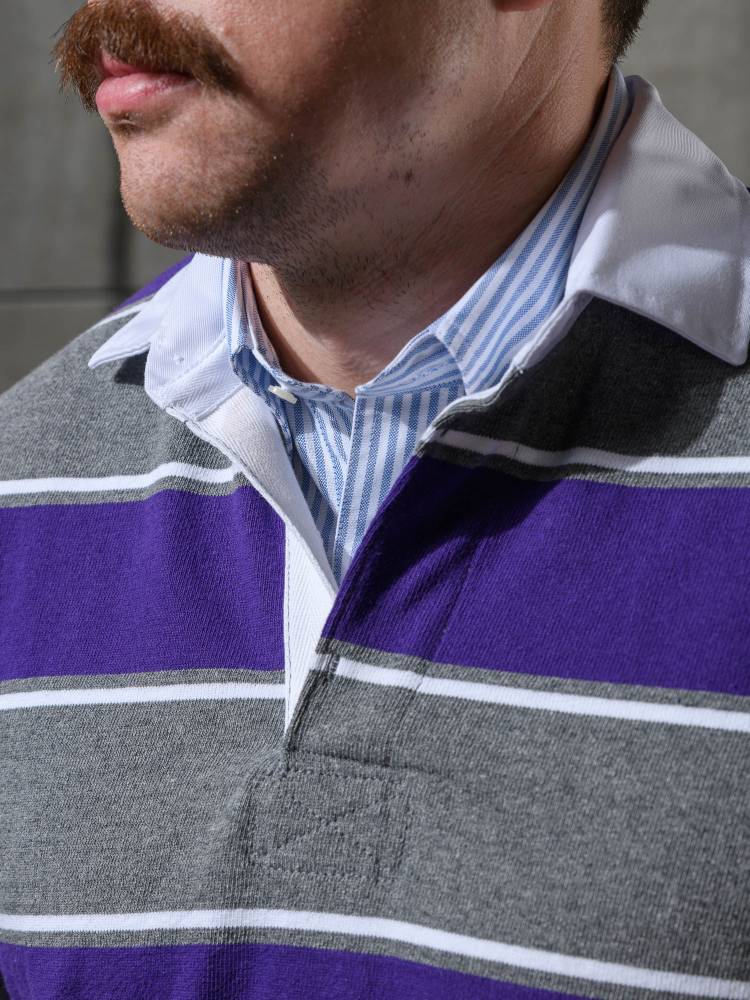 Аутентичная регбийка от канадского бренда Barbarian выполнена в традиционном дизайне Soho Stripe с эффектным трёхцветным узором из горизонтальных полос, серого, фиолетового и белого цвета.
