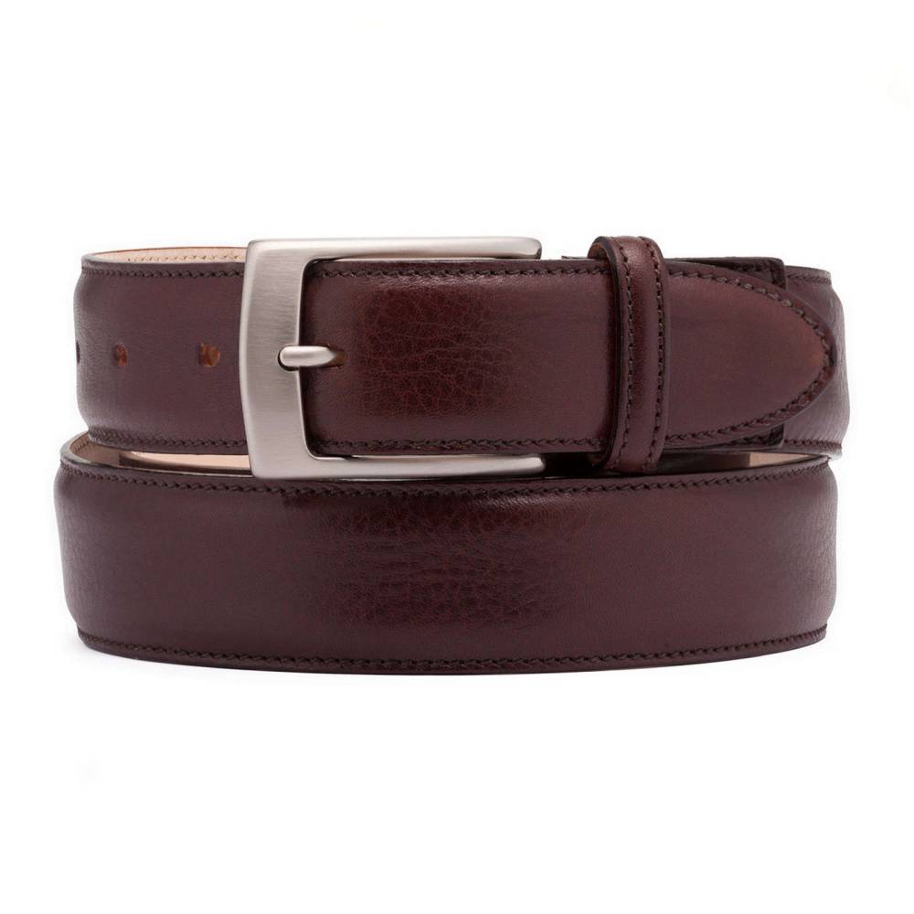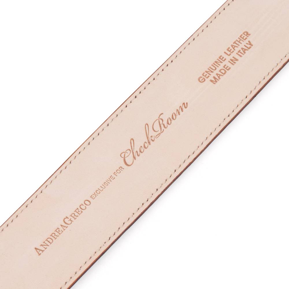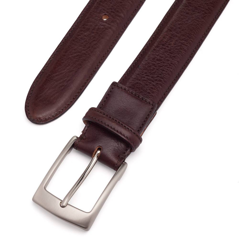 Классический мужской ремень создан эксклюзивно для бутика Checkroom в небольшой итальянской мастерской Andrea Greco. Полотно ремня выполнено из плотной зернистой телячьей кожи тёмно-коричневого цвета. Модель имеет традиционную прямоугольную пряжку из стали с матовой поверхностью серебристого цвета.