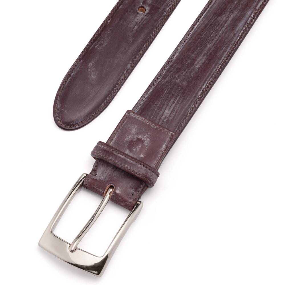 Классический мужской ремень создан эксклюзивно для бутика Checkroom в небольшой итальянской мастерской Andrea Greco. Полотно ремня выполнено из плотной телячьей кожи тёмно-коричневого цвета. С внешней стороны кожа обработана воском. Эта особенность взята из старинных традиций производства ремней. Заказчики после приобретения ремня сами делали финальную обработку, заполировывая воск в кожу. После этого она становилась блестящей. Для полировки рекомендуется использовать щётку с натуральным ворсом или отрезок хлопковой ткани. Модель имеет традиционную прямоугольную пряжку из никелированной стали с глянцевой поверхностью серебристого цвета.