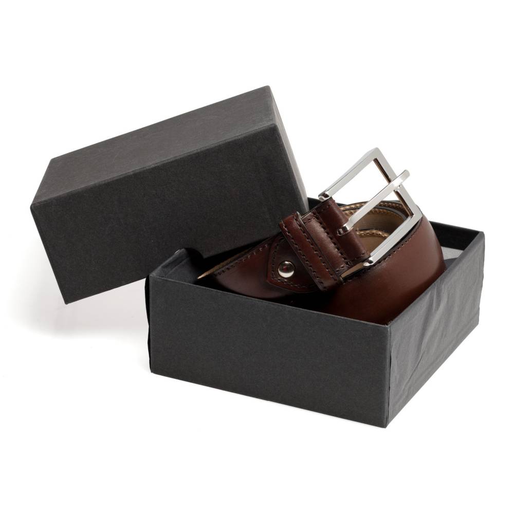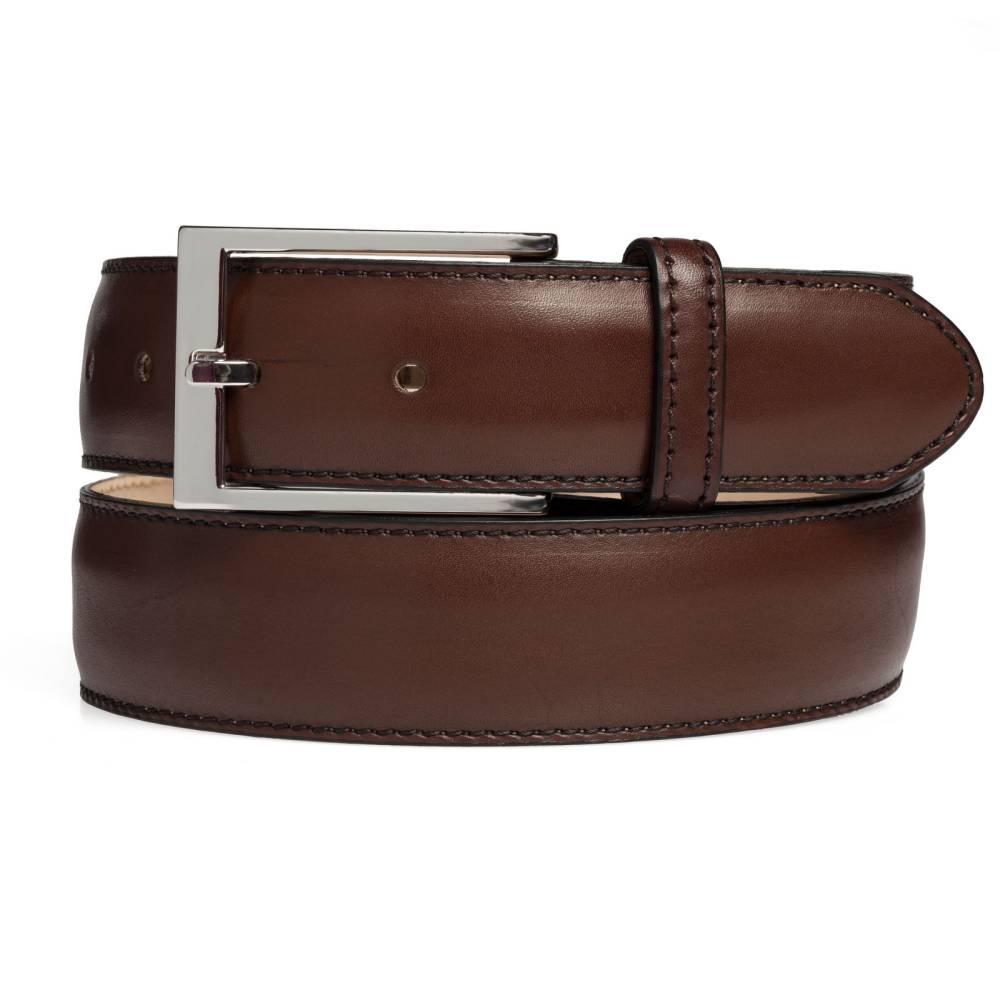 Классический мужской ремень испанского бренда Artisan из гладкой телячьей кожи темно-коричневого цвета. Модель имеет традиционную прямоугольную пряжку из никелированной латуни. К ремню прилагается фирменная коробка.