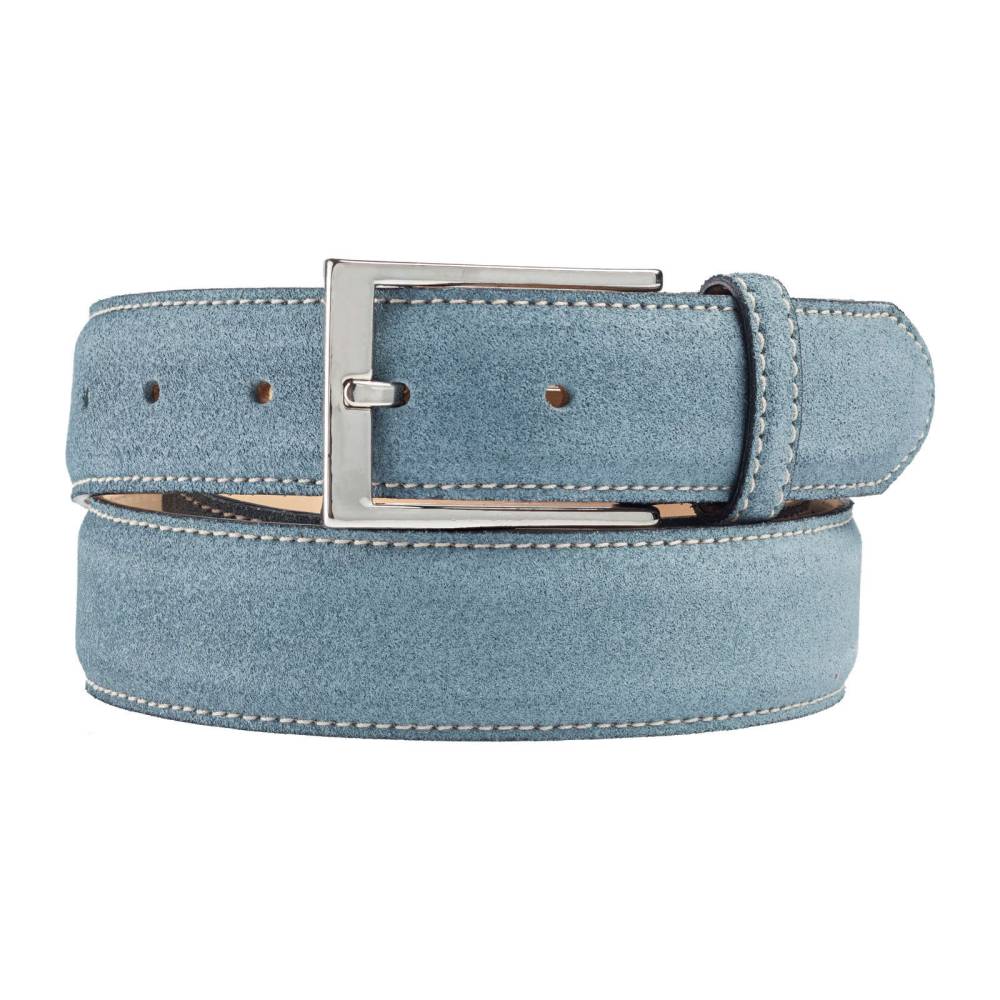 Классический мужской ремень испанского бренда Artisan из мягкой бархатистой замши голубого цвета. Модель имеет традиционную прямоугольную пряжку из никелированной латуни. К ремню прилагается фирменная коробка.