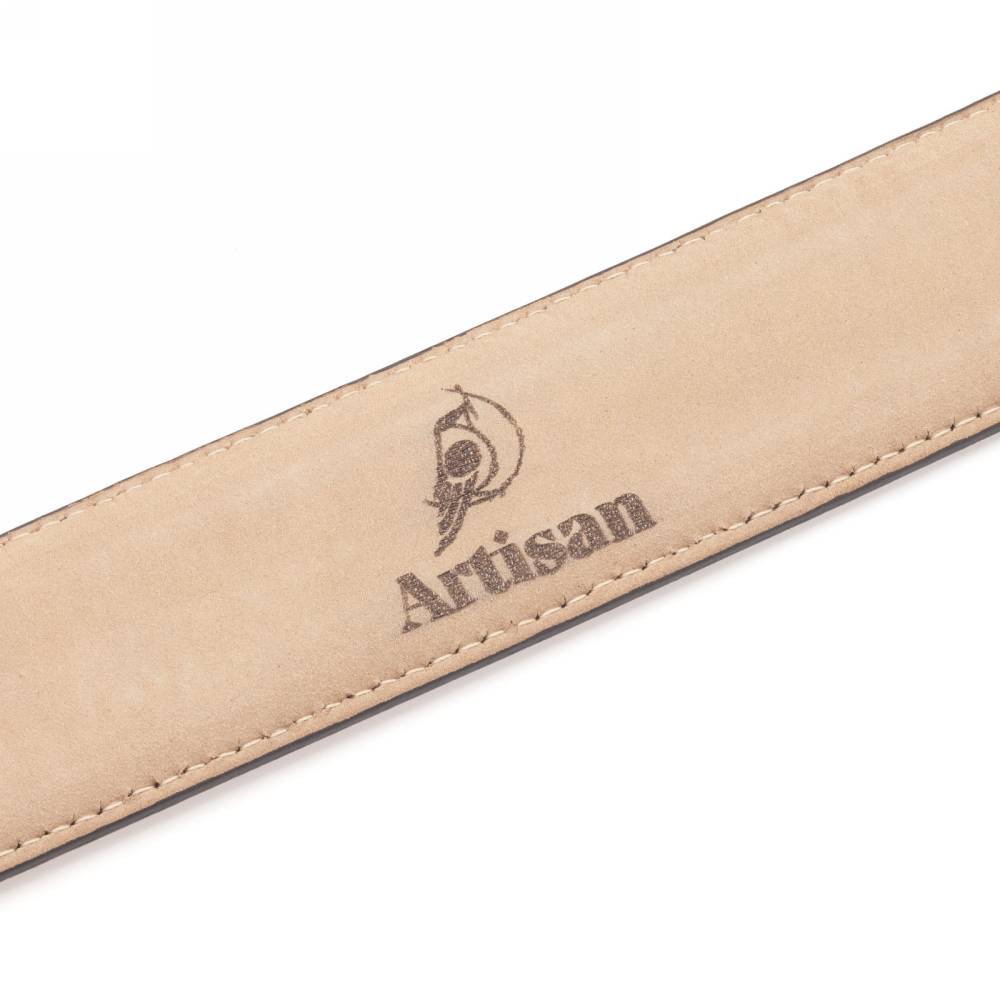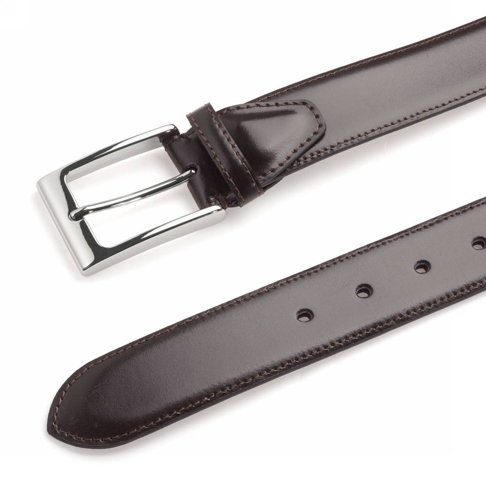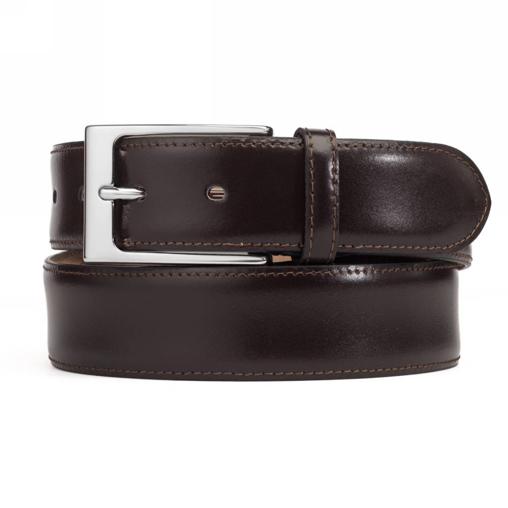 Классический мужской ремень Artisan из гладкой тёмно-коричневой телячьей кожи с отполированной до блеска поверхностью. Внутренняя часть из бежевого нубука. Модель имеет традиционную прямоугольную пряжку из никелированной латуни. Ремень сделан на небольшом семейном предприятии на Сицилии, которое специализируется на производстве ремней.