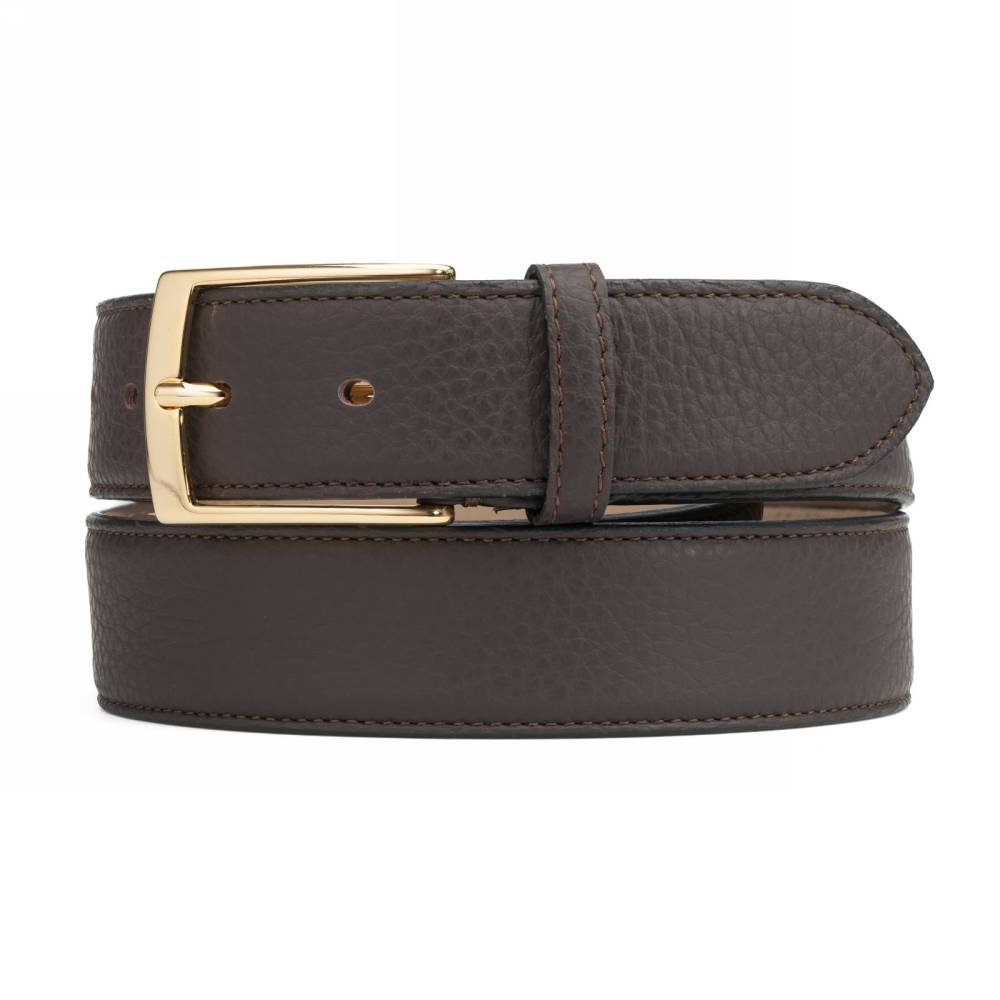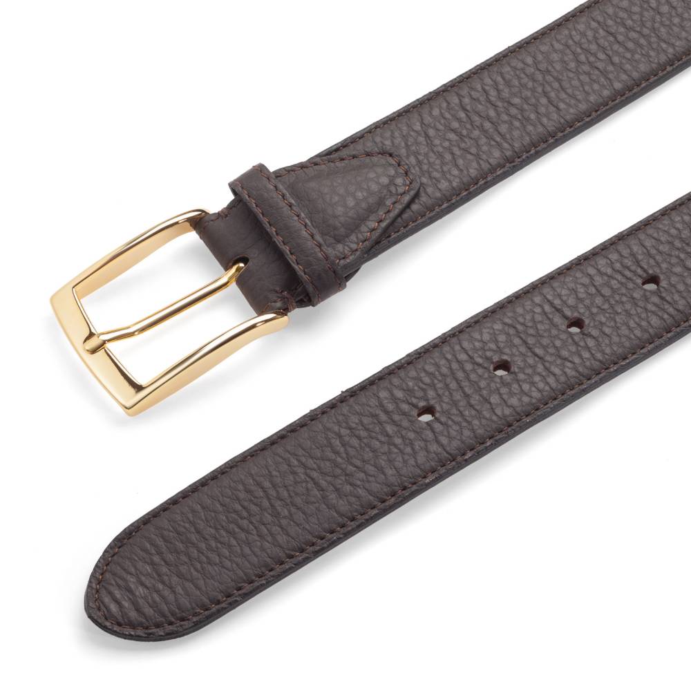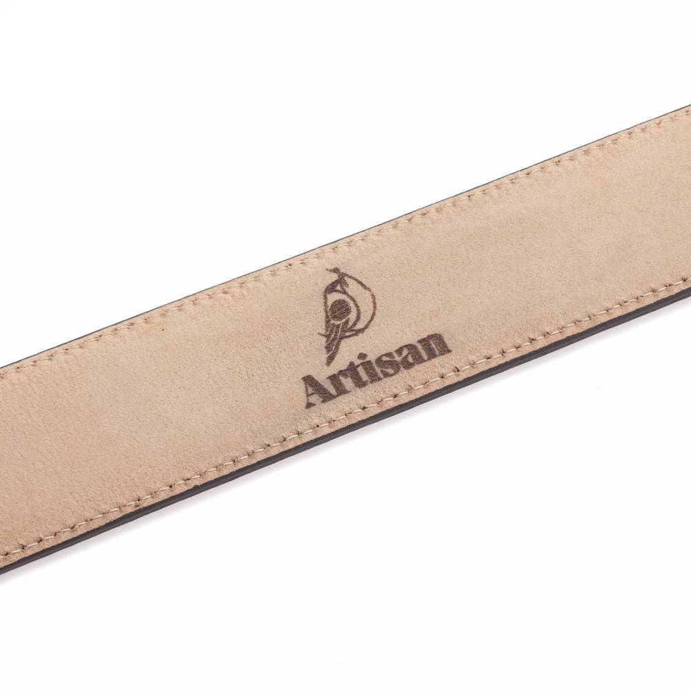 Неформальный мужской ремень Artisan из тёмно-коричневой оленьей кожи с характерной зернистой поверхностью. Внутренняя часть из бежевого нубука. Модель оснащена традиционной прямоугольной пряжкой золотистого цвета из сплава цинка, алюминия и меди (zamak). Ремень сделан на небольшом семейном предприятии на Сицилии, которое специализируется на производстве ремней.