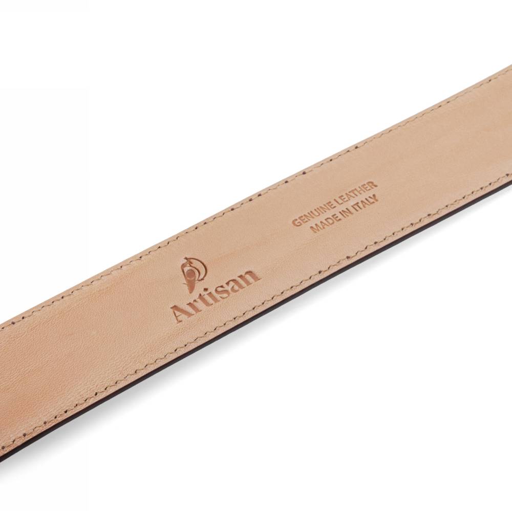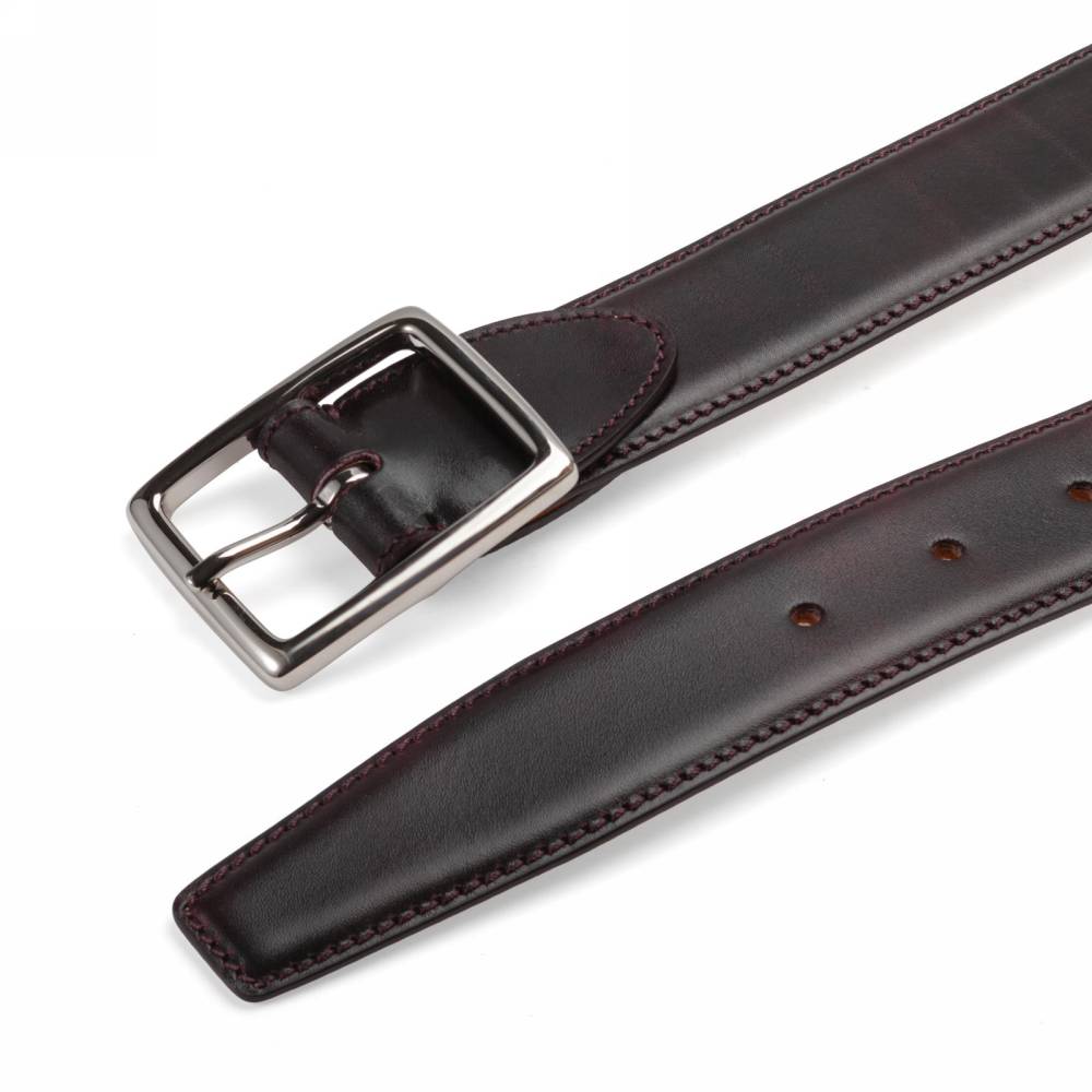 Классический мужской ремень испанского бренда Artisan из гладкой телячьей кожи «museum calf» тёмно-бордового цвета. Особенностью данного типа кожи является характерный «пятнистый окрас», который схож с узорами на мраморе. Модель имеет элегантную прямоугольную пряжку из никелированной латуни.