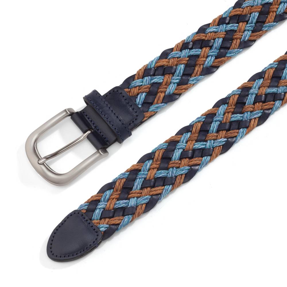 Повседневный плетёный ремень Artisan с округлой пряжкой с матовой поверхностью. Полотно ремня выполнено из переплетения прочных хлопковых нитей голубого и светло-коричневого цвета, а также полос из телячьей кожи тёмно-синего цвета. Модель оснащена лёгкой пряжкой серебристого цвета из сплава цинка, алюминия и меди (zamak). Ремень сделан на небольшом семейном предприятии на Сицилии, которое специализируется на производстве ремней.