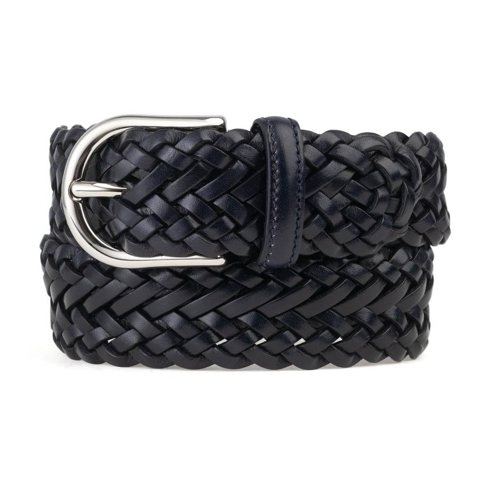 Классический мужской плетёный ремень Artisan из плотной телячьей кожи тёмно-синего цвета. Модель имеет элегантную латунную пряжку, покрытую никелем. Ремень сделан на небольшом семейном предприятии в Тоскане, знаменитом кожевенном регионе Италии. Аксессуар великолепно смотрится с фактурными летними, демисезонными и зимними вещами: отличным сочетанием будут фланель, вельвет, твид, плотный деним, лён или хлопок.