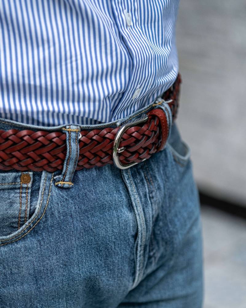 Классический мужской плетёный ремень Artisan из плотной телячьей кожи бордового цвета. Модель имеет элегантную латунную пряжку, покрытую никелем. Ремень сделан на небольшом семейном предприятии в Тоскане, знаменитом кожевенном регионе Италии. Аксессуар великолепно смотрится с фактурными летними, демисезонными и зимними вещами: отличным сочетанием будут фланель, вельвет, твид, плотный деним, лён или хлопок.