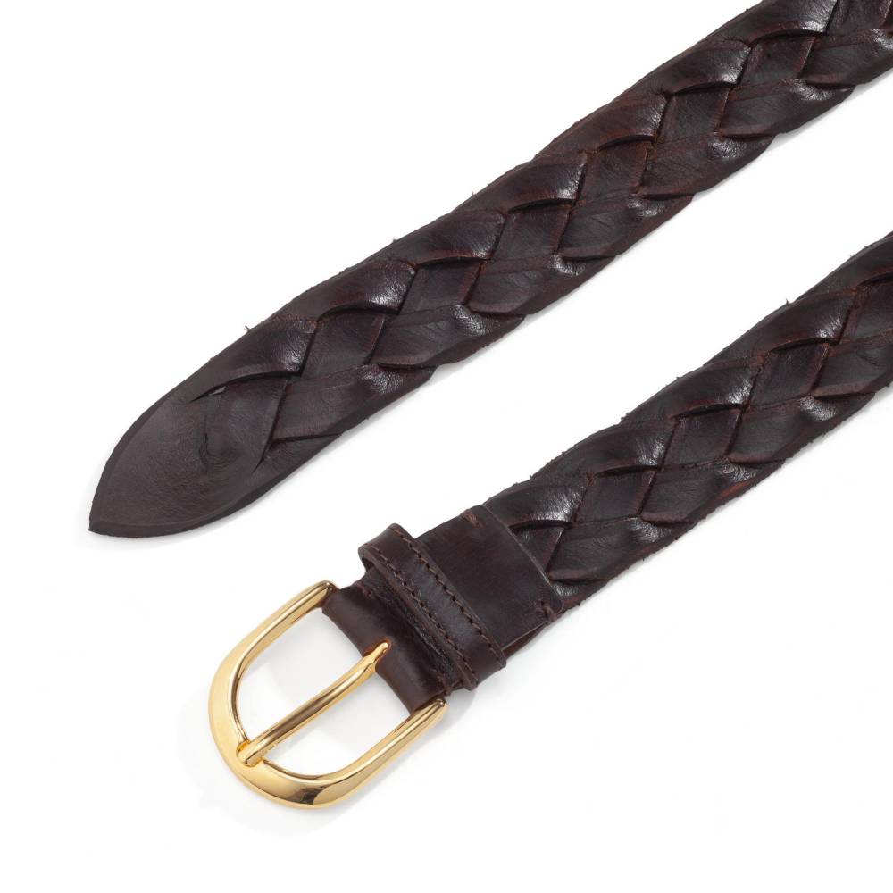 Классический мужской плетёный ремень Artisan из плотной телячьей кожи тёмно-коричневого цвета. Модель оснащена округлой пряжкой из цельной латуни, покрытой напылением из золота 18к. Особенностью модели является ручное плетение, которое начинается от острого конца ремня. Ремень великолепно смотрится с фактурными летними, демисезонными и зимними вещами: отличным сочетанием будут фланель, вельвет, твид, плотный деним, лён или хлопок.