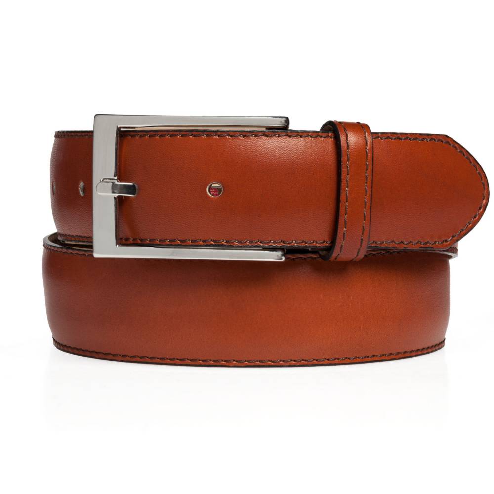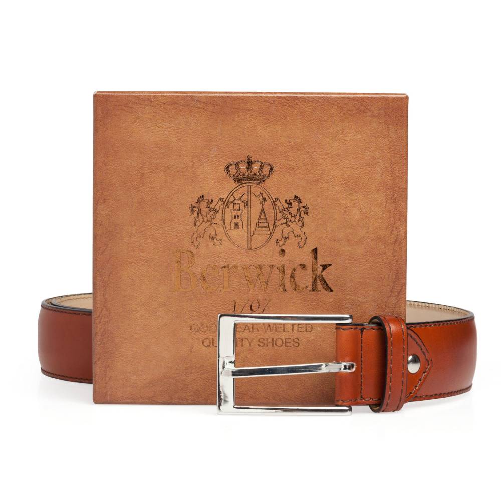 Классический мужской ремень испанского бренда Berwick из гладкой коричневой телячьей кожи растительного дубления. Модель имеет традиционную прямоугольную пряжку из никелированной латуни. К ремню прилагается фирменная коробка.
