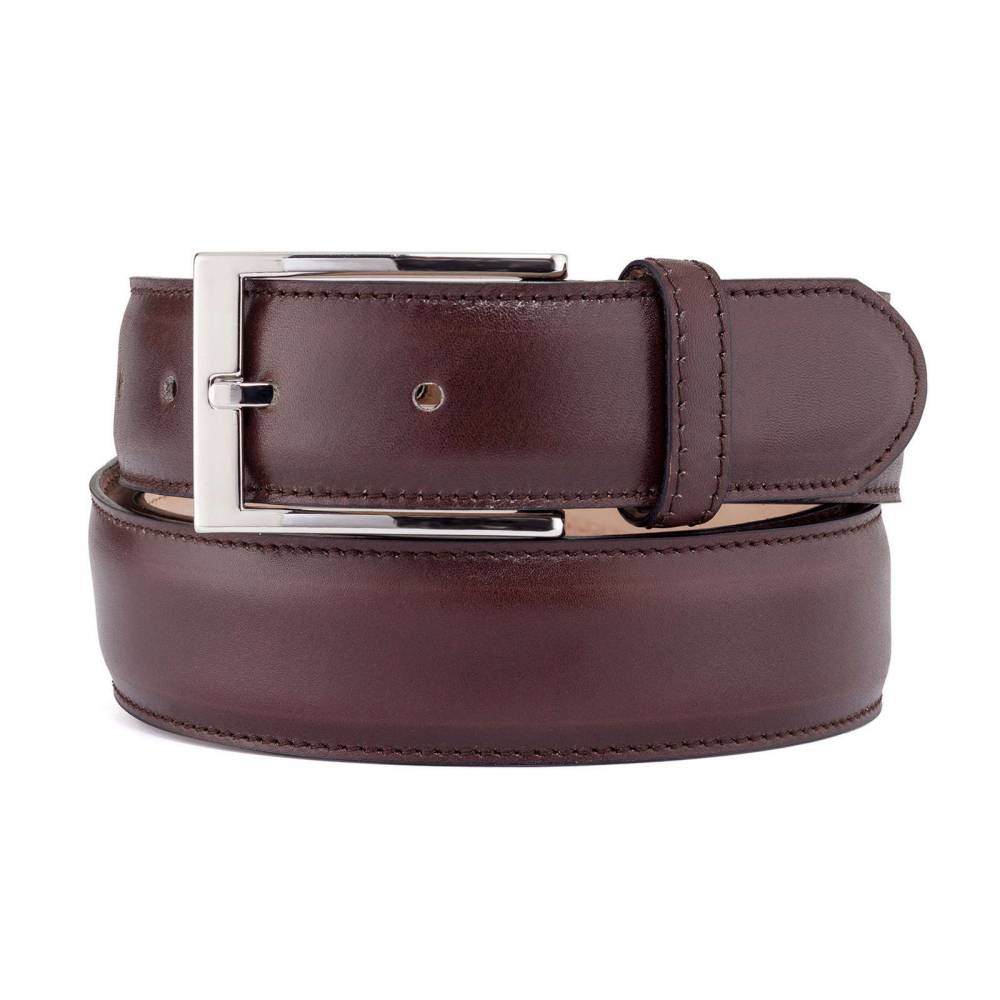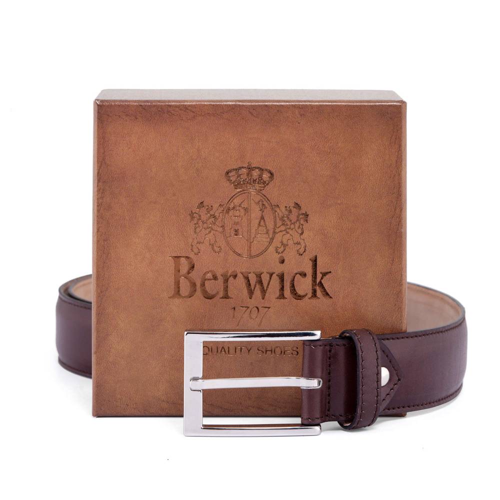 Классический мужской ремень испанского бренда Berwick из телячьей кожи тёмно-коричневого цвета. Модель имеет традиционную прямоугольную пряжку из никелированной латуни. К ремню прилагается фирменная коробка.