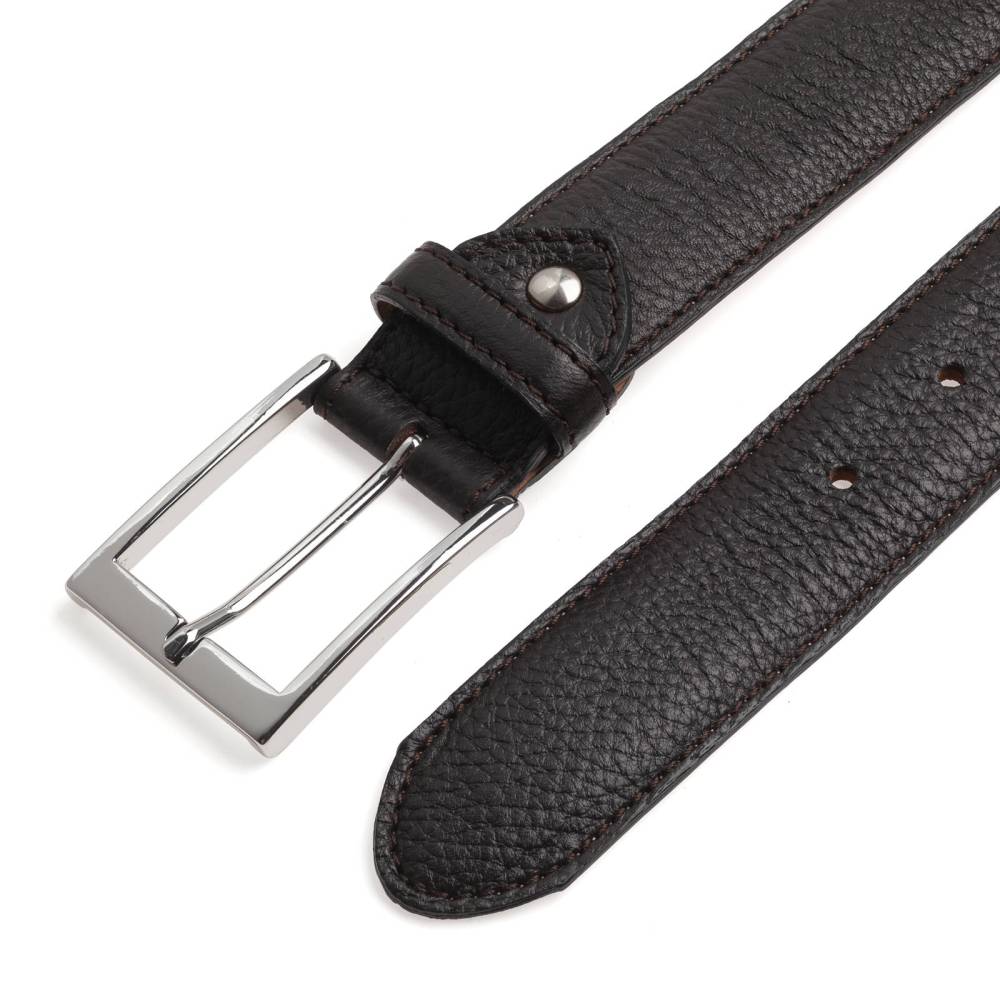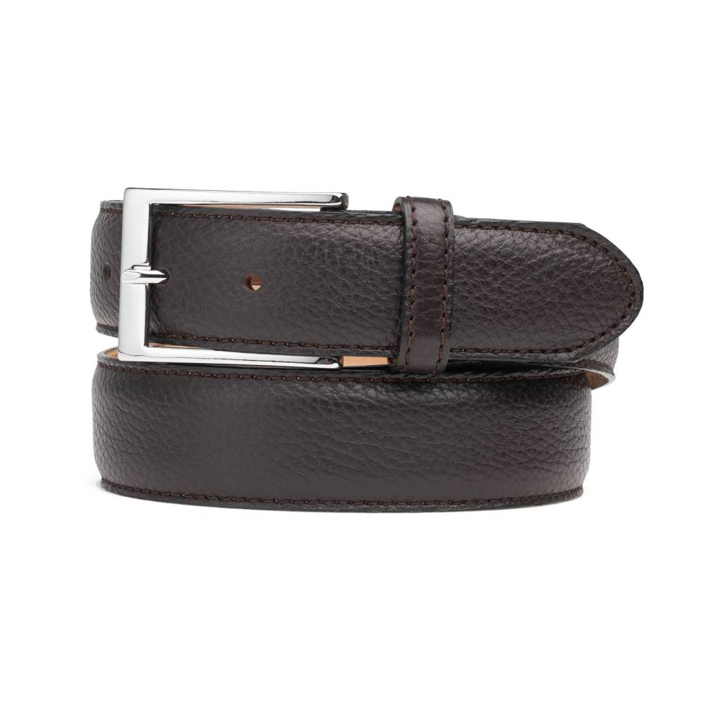 Классический ремень испанской марки Berwick, сделанный из зернистой оленьей кожи тёмно-коричневого цвета. Модель оснащена прямоугольной латунной пряжкой, придающей ремню вневременной мужественный силуэт. В комлекте прилагается фирменная коробка.