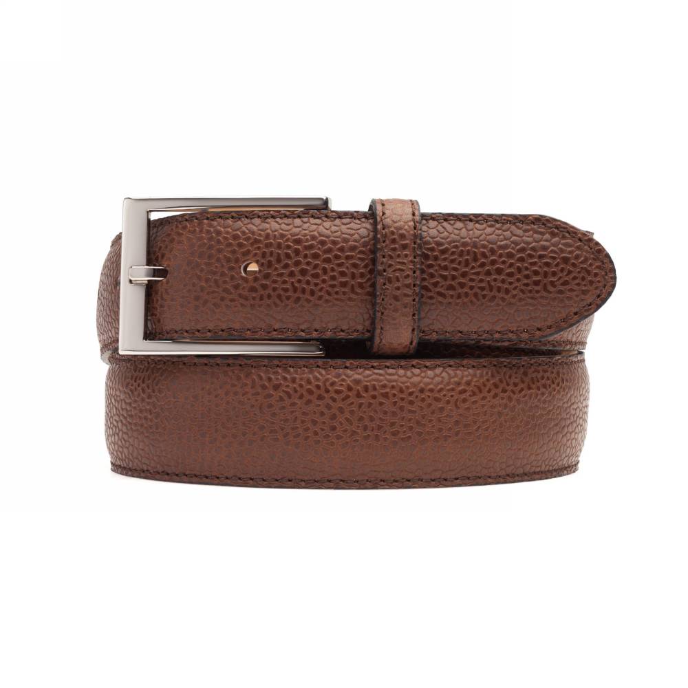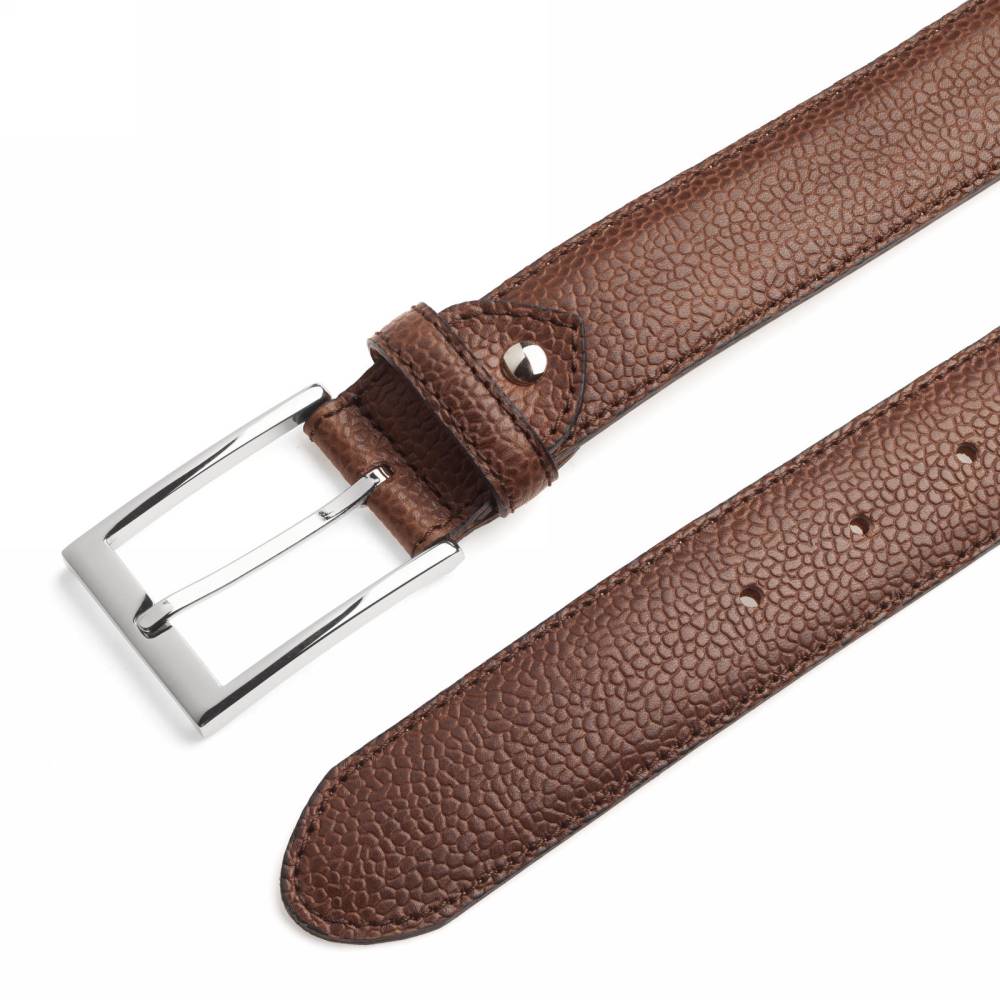 Классический мужской ремень испанского бренда Berwick из телячьей кожи коричневого цвета с зернистой фактурой. Модель имеет традиционную прямоугольную пряжку из лёгкого сплава цинка, алюминия и меди (zamak). Обратная сторона из кожи растительного дубления. К ремню прилагается фирменная коробка.