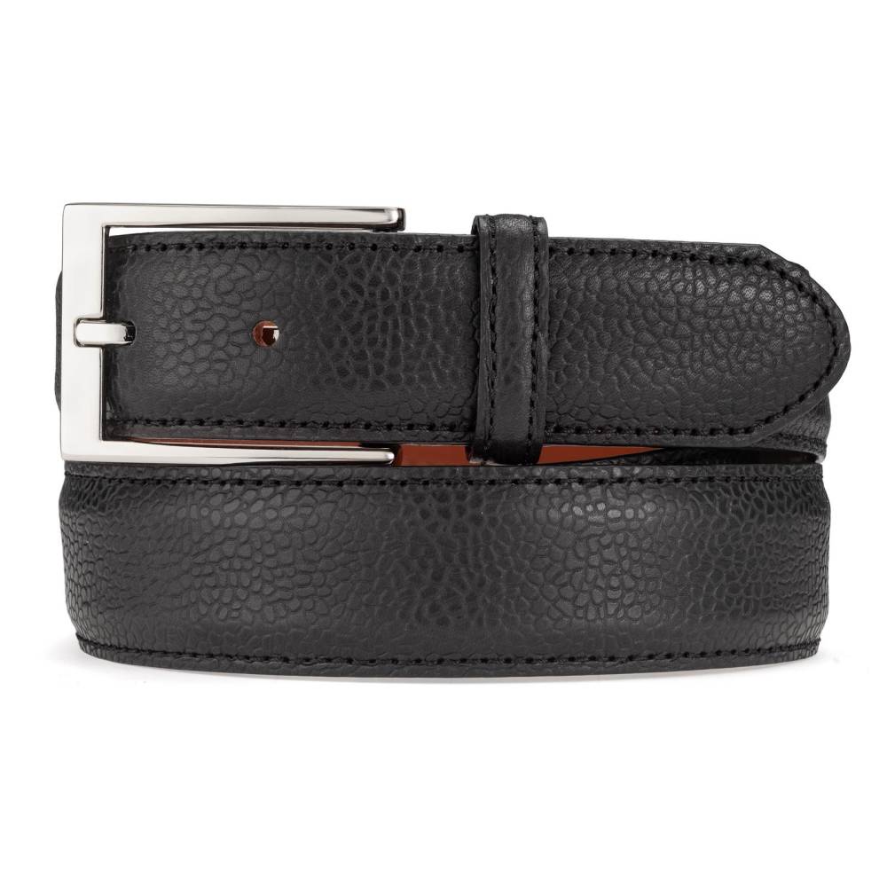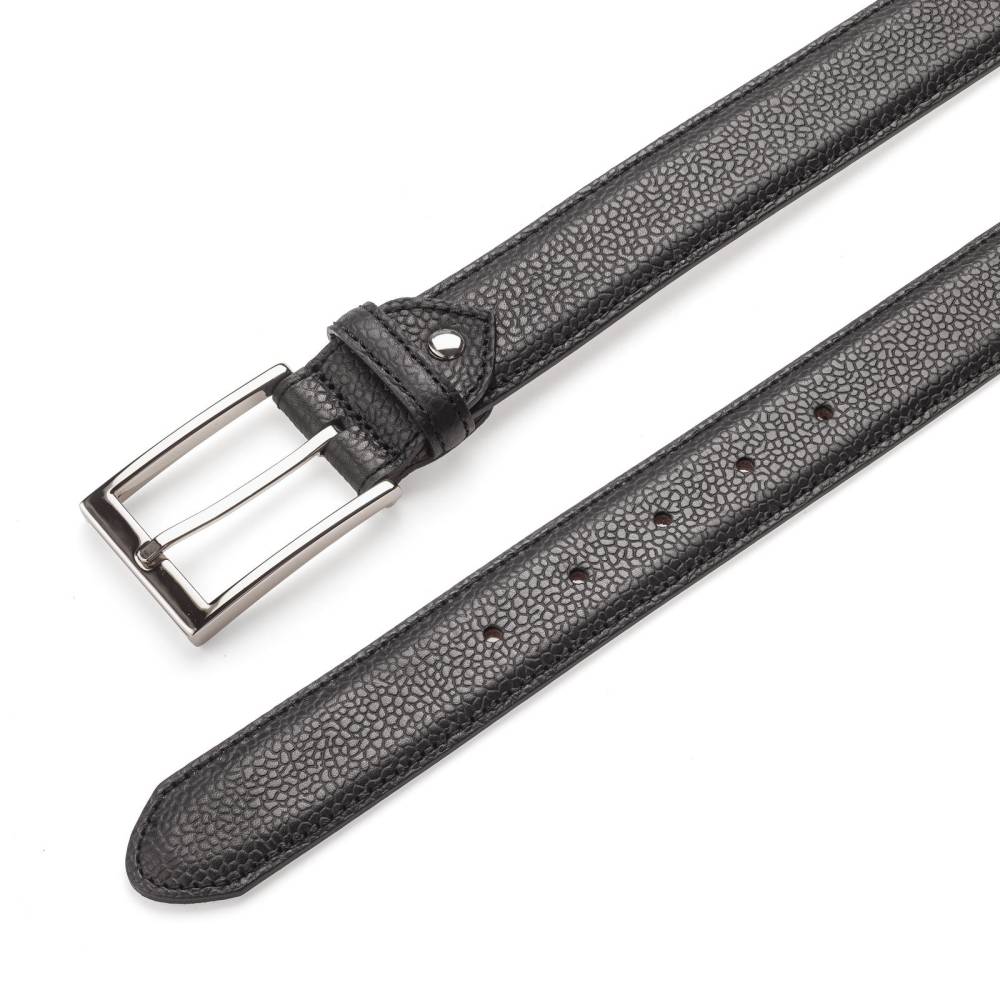 Классический мужской ремень испанского бренда Berwick из телячьей кожи чёрного цвета с зернистой фактурой. Модель имеет традиционную прямоугольную пряжку из лёгкого сплава цинка, алюминия и меди (zamak). К ремню прилагается фирменная коробка.