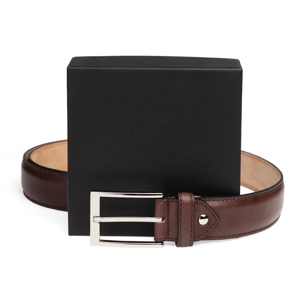 Классический мужской ремень испанского бренда Artisan из гладкой телячьей кожи тёмно-коричневого цвета. Модель имеет традиционную прямоугольную пряжку из никелированной латуни. К ремню прилагается фирменная коробка.