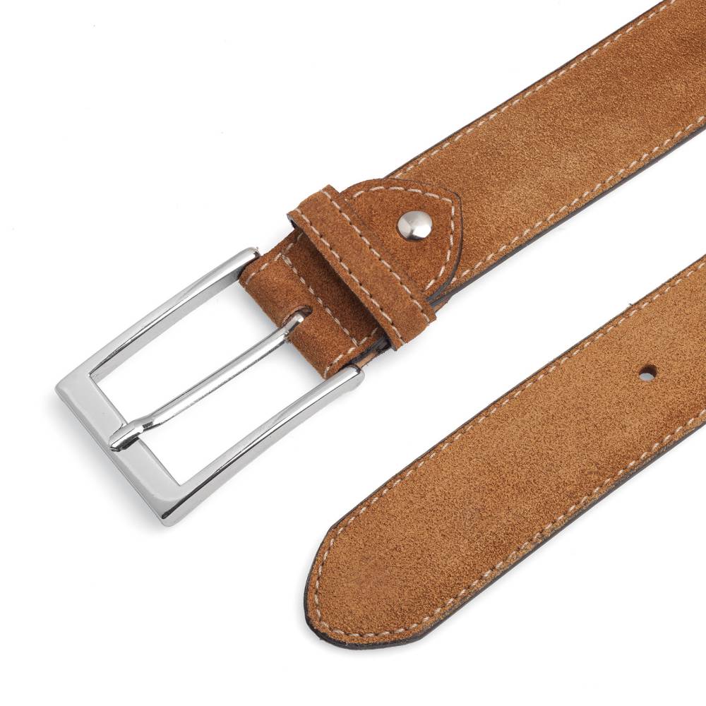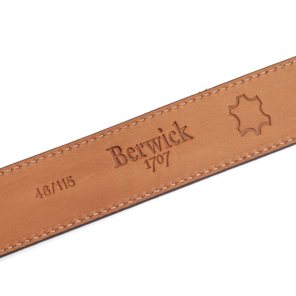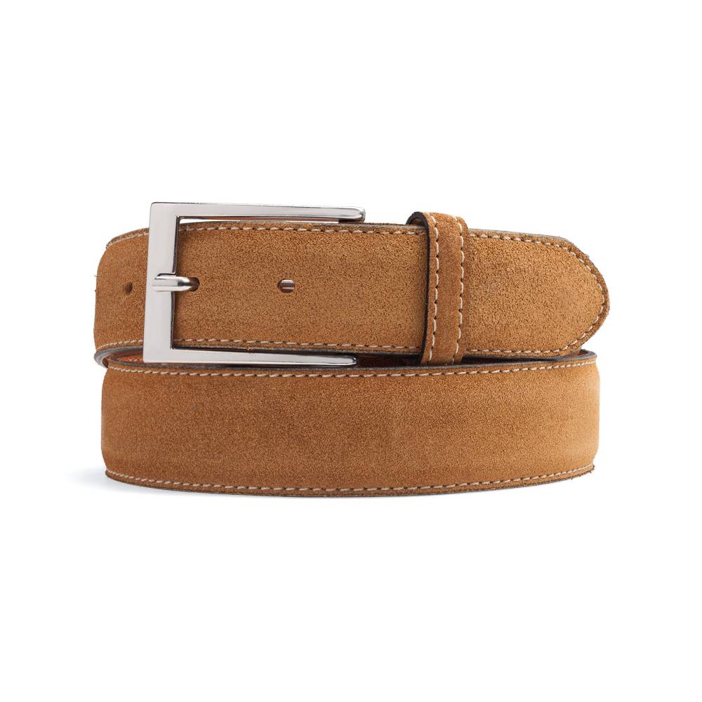 Классический мужской ремень испанского бренда Berwick из приятной на ощупь бархатистой замши светло-коричневого цвета. Модель имеет традиционную прямоугольную пряжку из никелированной латуни. К ремню прилагается фирменная коробка.
