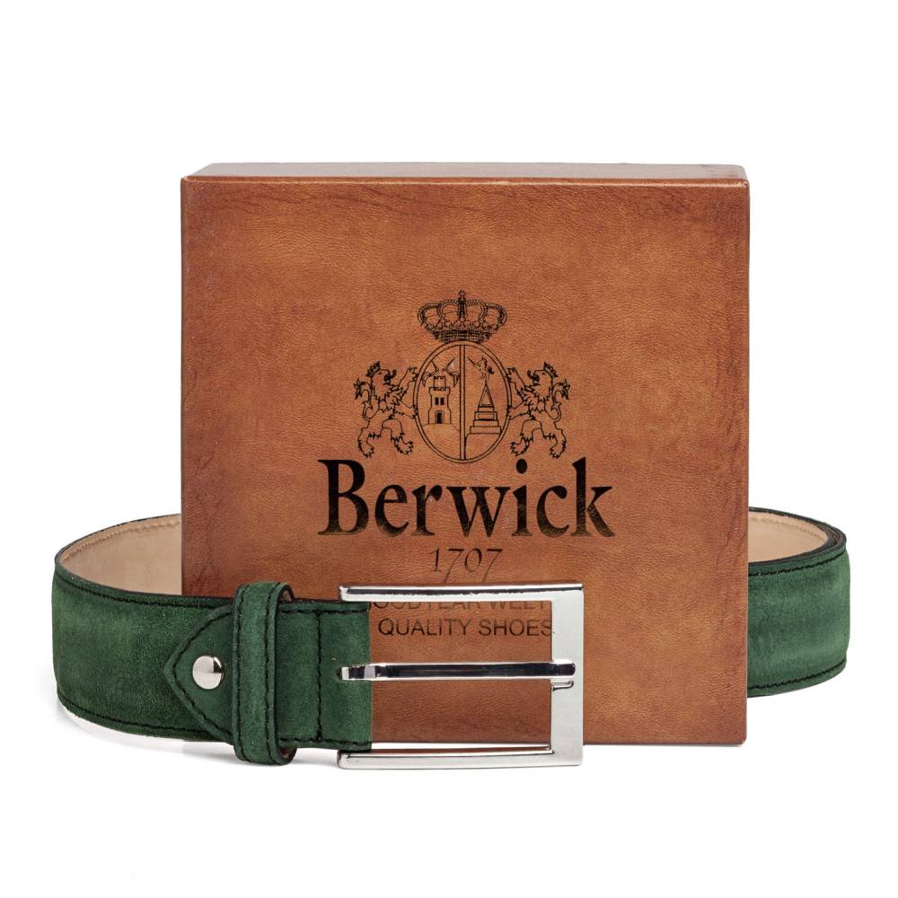 Мужской ремень испанского бренда Berwick из бархатистой замши насыщенного зелёного цвета и бежевой телячьей кожи. Модель имеет прямоугольную никелированную пряжку, украшенную неброским логотипом бренда. К ремню прилагается фирменная коробка.