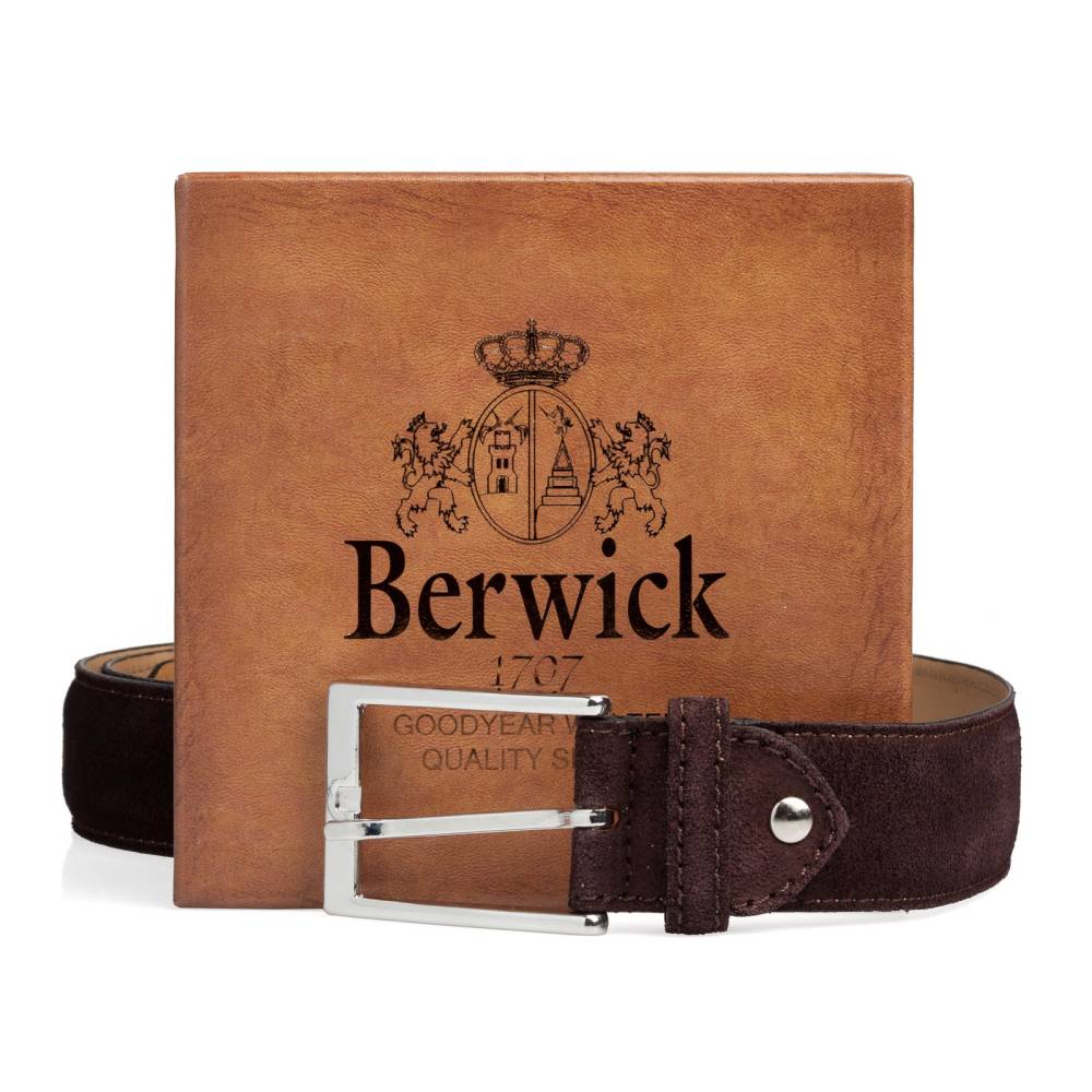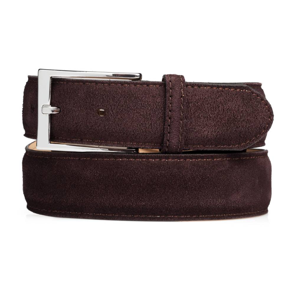 Классический мужской ремень испанского бренда Berwick из приятной на ощупь бархатистой замши тёмно-коричневого цвета. Модель имеет традиционную прямоугольную пряжку из никелированной латуни. К ремню прилагается фирменная коробка.