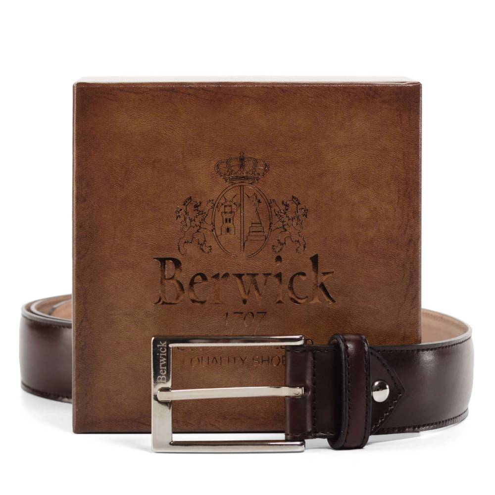 Классический мужской ремень испанского бренда Berwick из телячьей кожи тёмно-коричневого цвета. Модель имеет прямоугольную пряжку из никелированной стали. Пряжка украшена логотипом марки. К ремню прилагается фирменная коробка.