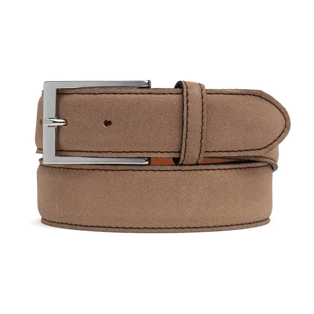 Классический мужской ремень испанского бренда Berwick из приятной на ощупь замши бежевого цвета. Модель имеет традиционную прямоугольную пряжку из никелированной латуни. К ремню прилагается фирменная коробка.