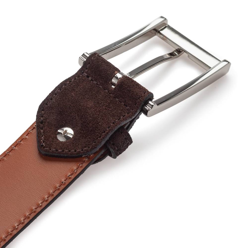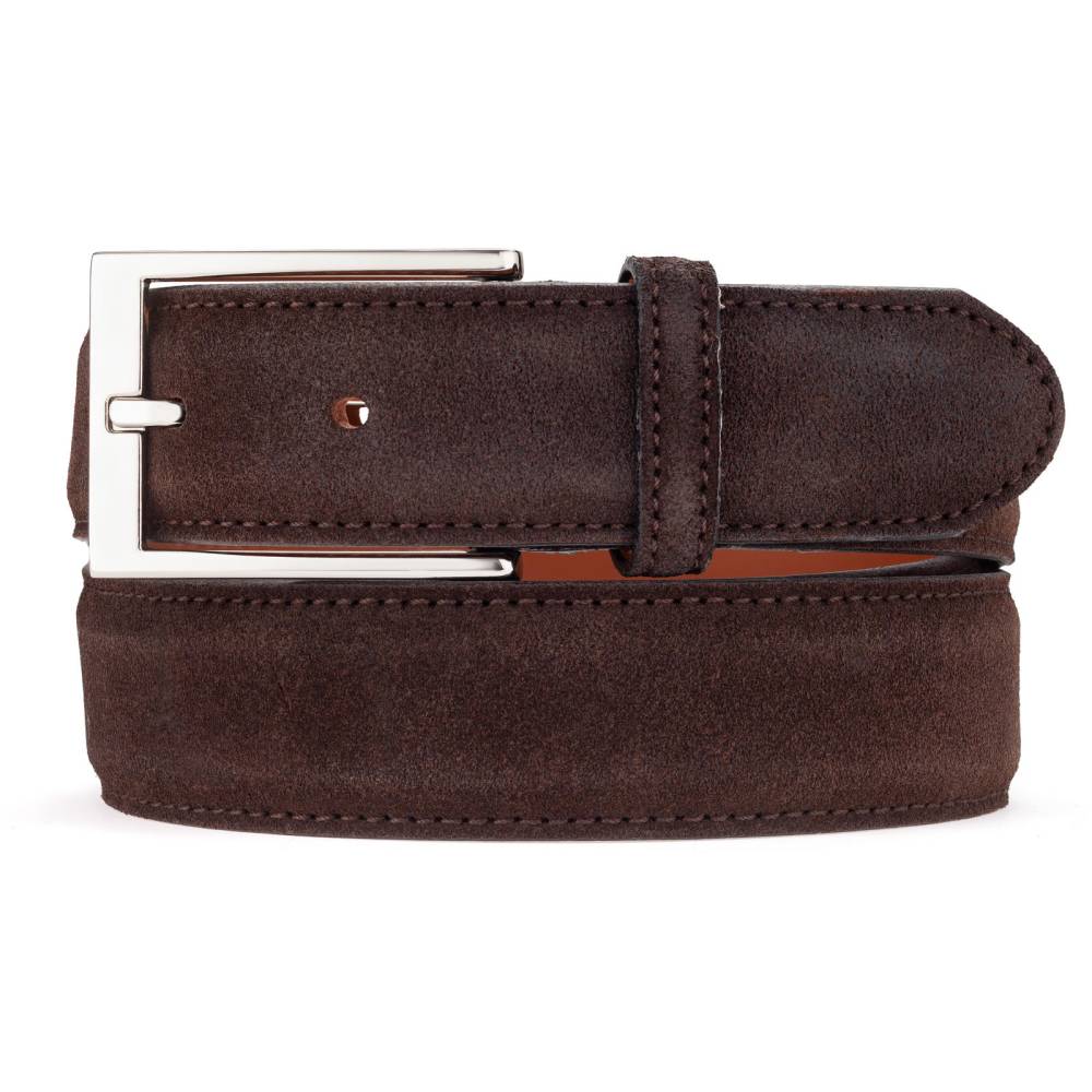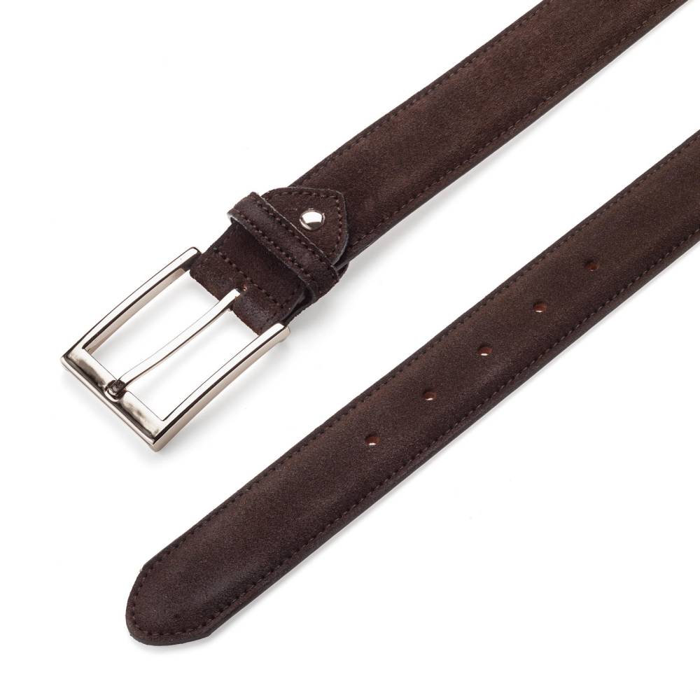 Классический мужской ремень испанского бренда Berwick из замши тёмно-коричневого цвета. Модель имеет традиционную прямоугольную пряжку из лёгкого сплава цинка, алюминия и меди (zamak). Обратная сторона из кожи растительного дубления. К ремню прилагается фирменная коробка.