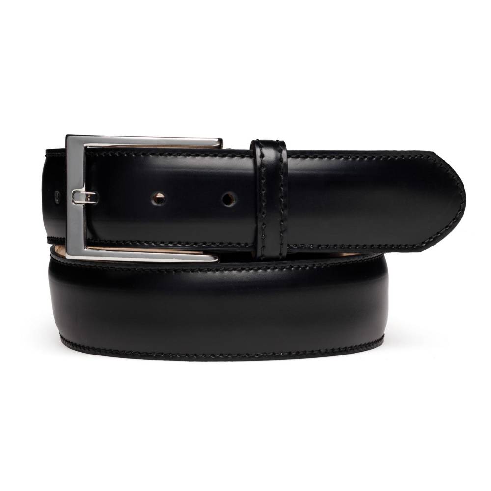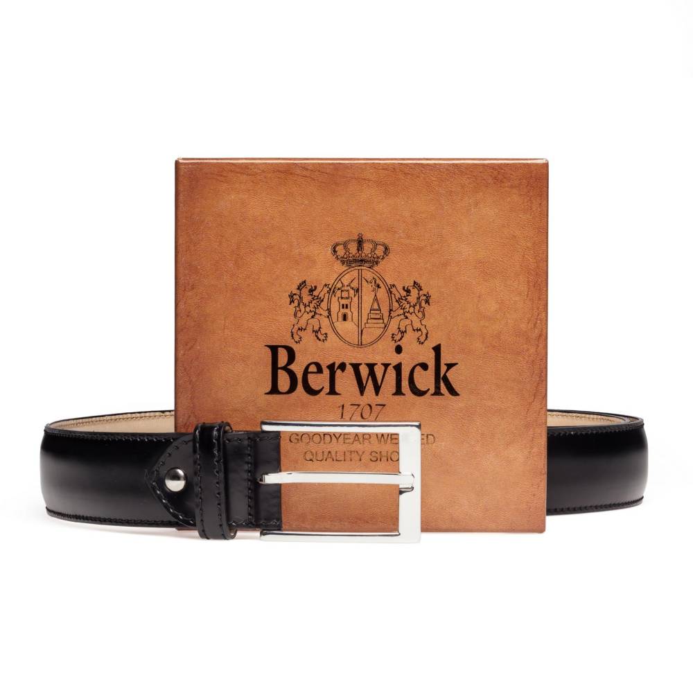 Классический мужской ремень испанского бренда Berwick выполнен из полированной телячьей кожи чёрного цвета. Такая кожа отличается характерным блеском и упругостью. Ремень имеет традиционную прямоугольную пряжку из никелированной латуни. Фирменная коробка прилагается.