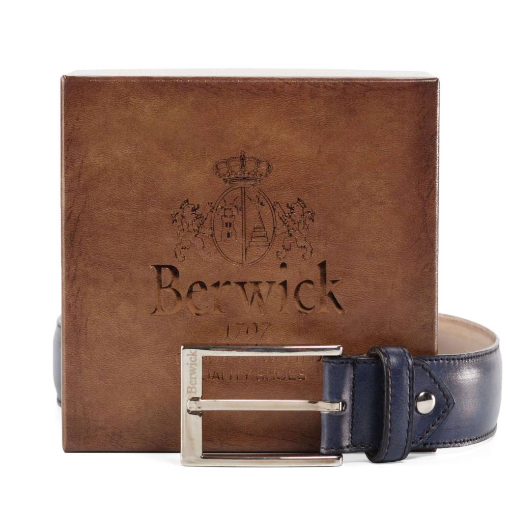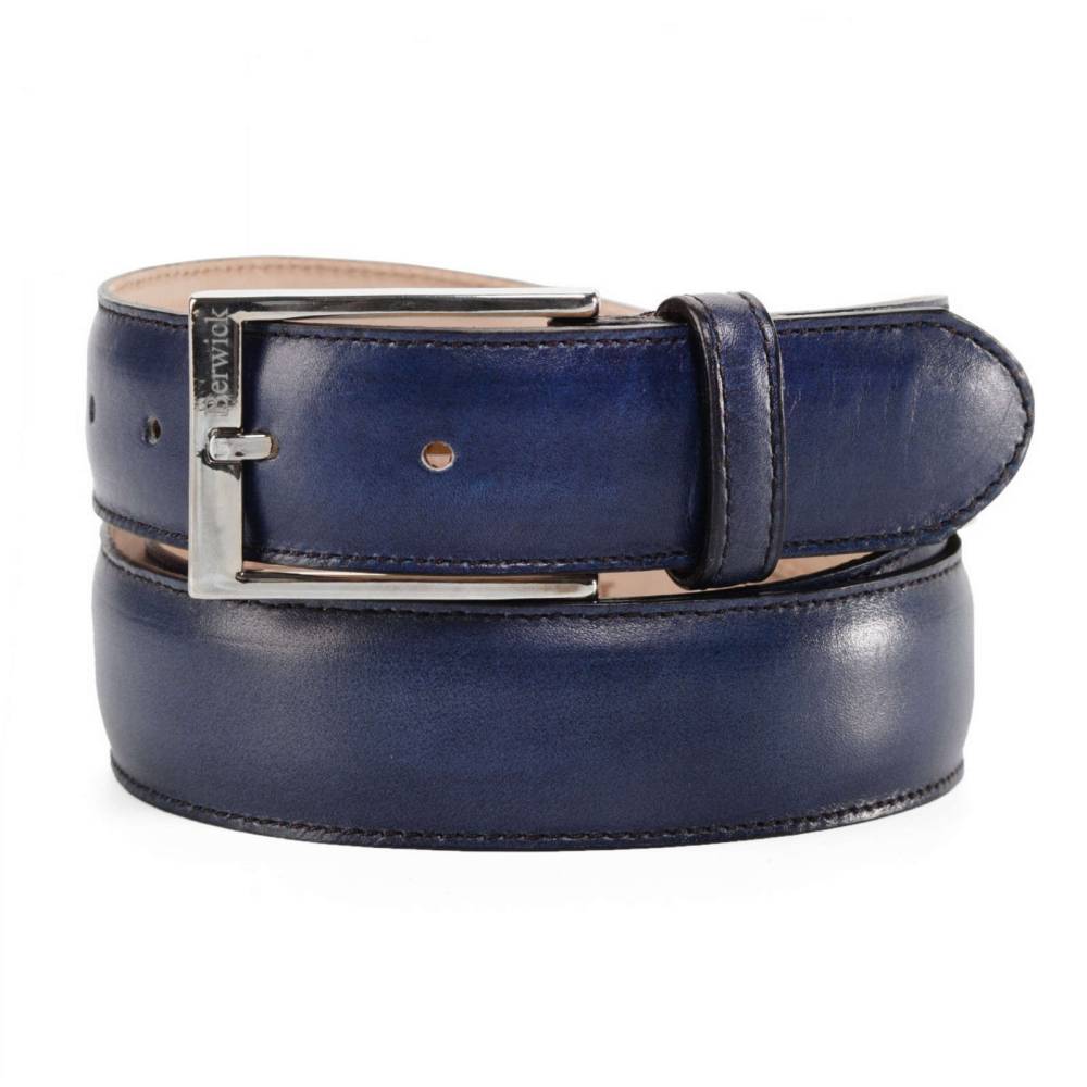 Классический мужской ремень испанского бренда Berwick из телячьей кожи насыщенного кобальтового цвета. Особенностью модели является техника ручной окраски, которая создает неповторимый внешний вид кожи с неравномерной игрой цвета и градиентными затемнениями. Модель имеет традиционную прямоугольную пряжку из лёгкого сплава цинка, алюминия и меди (zamak). Обратная сторона из кожи растительного дубления. К ремню прилагается фирменная коробка.
