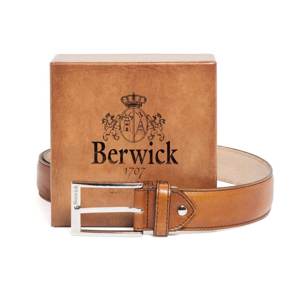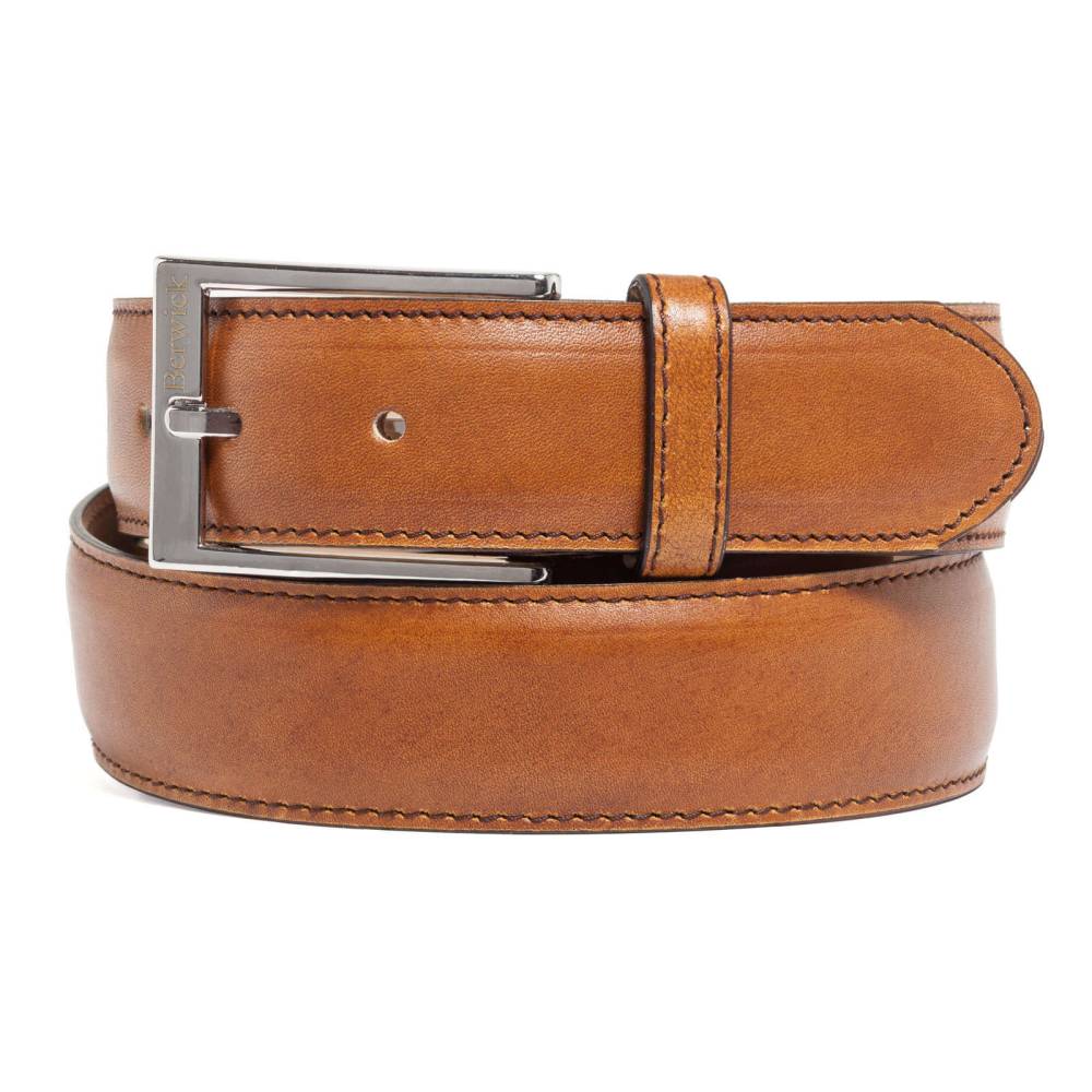 Классический мужской ремень испанского бренда Berwick из телячьей кожи светло-коричневого цвета. Особенностью модели является техника ручной окраски, которая создает неповторимый внешний вид кожи с неравномерной игрой цвета и градиентными затемнениями. Ремень имеет традиционную прямоугольную пряжку из никелированной латуни. Фирменная коробка прилагается.