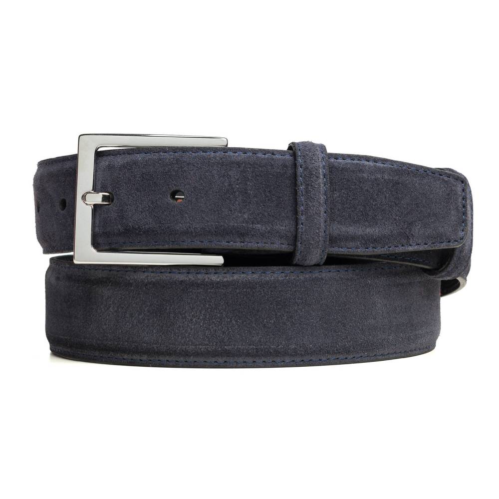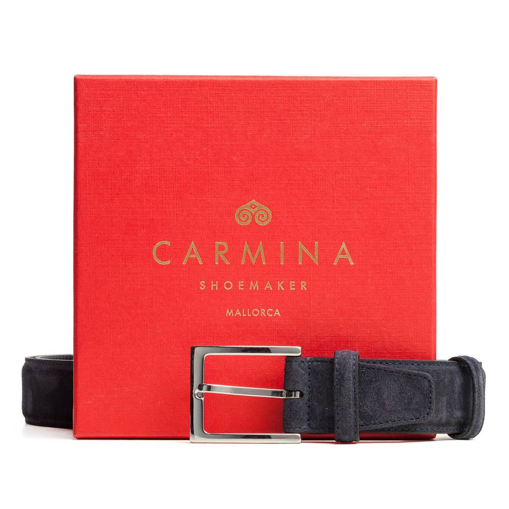 Классический мужской ремень испанского бренда Carmina Shoemaker. Полотно ремня выполнено из высококачественной замши тёмно-синего цвета с внешней стороны, а с внутренней отделано матовой телячьей кожей. Ремень имеет традиционную прямоугольную пряжку из никелированной латуни. К ремню прилагается фирменная коробка.
