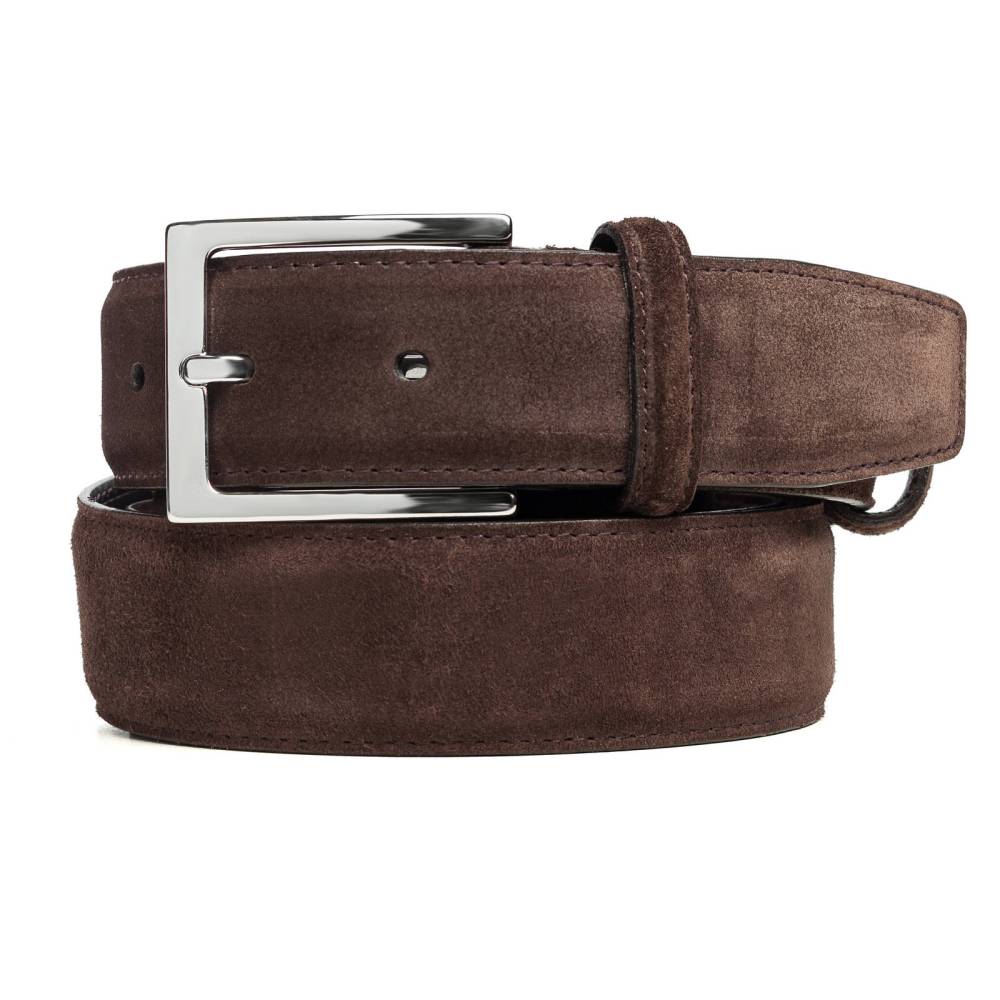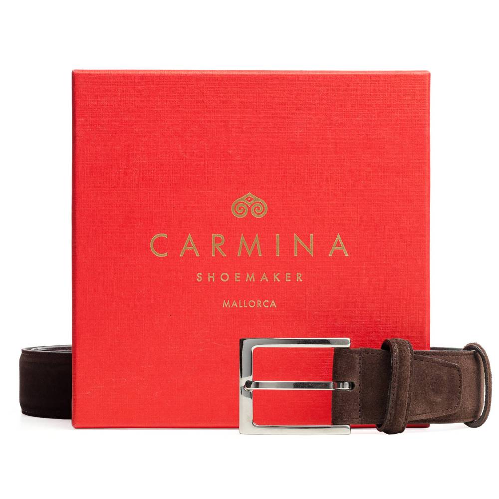 Классический мужской ремень испанского бренда Carmina Shoemaker. Полотно ремня выполнено из высококачественной замши тёмно-коричневого цвета с внешней стороны, а с внутренней отделано матовой телячьей кожей. Ремень имеет традиционную прямоугольную пряжку из никелированной латуни. К ремню прилагается фирменная коробка.