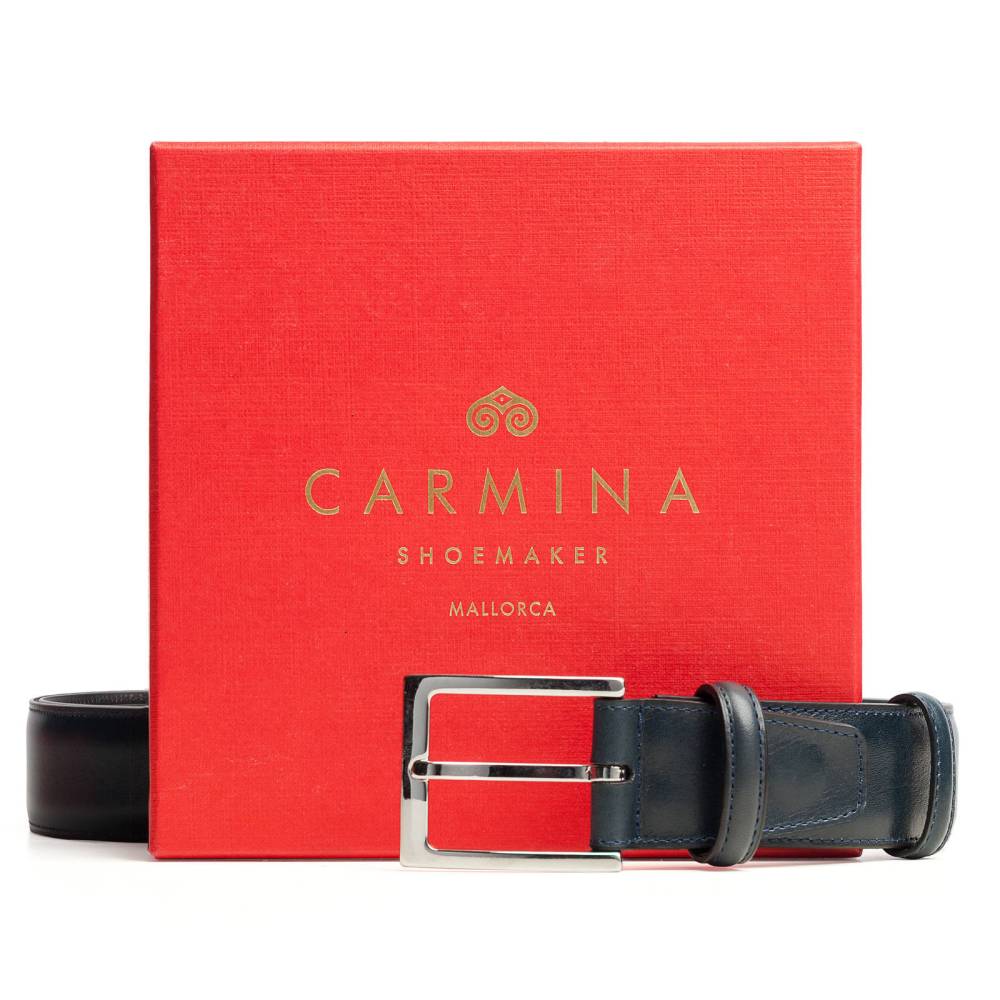 Классический мужской ремень испанского бренда Carmina Shoemaker. Полотно ремня выполнено из высококачественной гладкой кожи тёмно-синего цвета с внешней стороны, а с внутренней отделано матовой кожей. Ремень имеет традиционную прямоугольную пряжку из никелированной латуни. К ремню прилагается фирменная коробка.