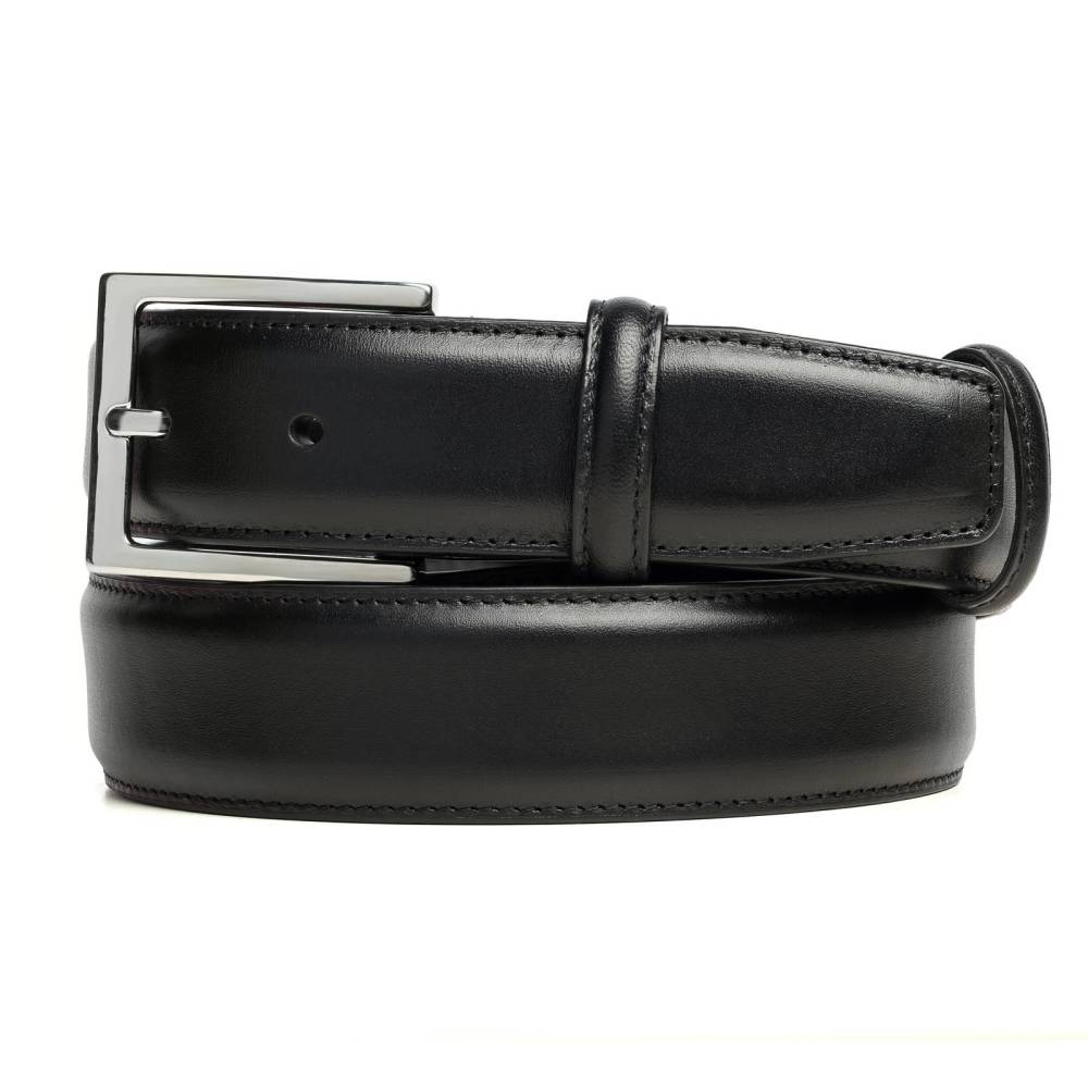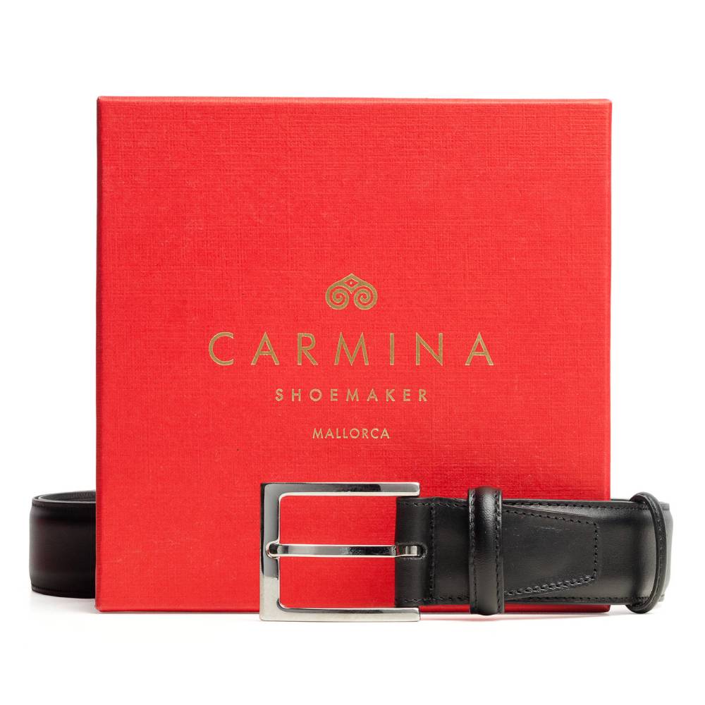 Классический мужской ремень испанского бренда Carmina Shoemaker. Полотно ремня выполнено из высококачественной гладкой кожи чёрного цвета с внешней стороны, а с внутренней отделано матовой кожей. Ремень имеет традиционную прямоугольную пряжку из никелированной латуни. К ремню прилагается фирменная коробка.