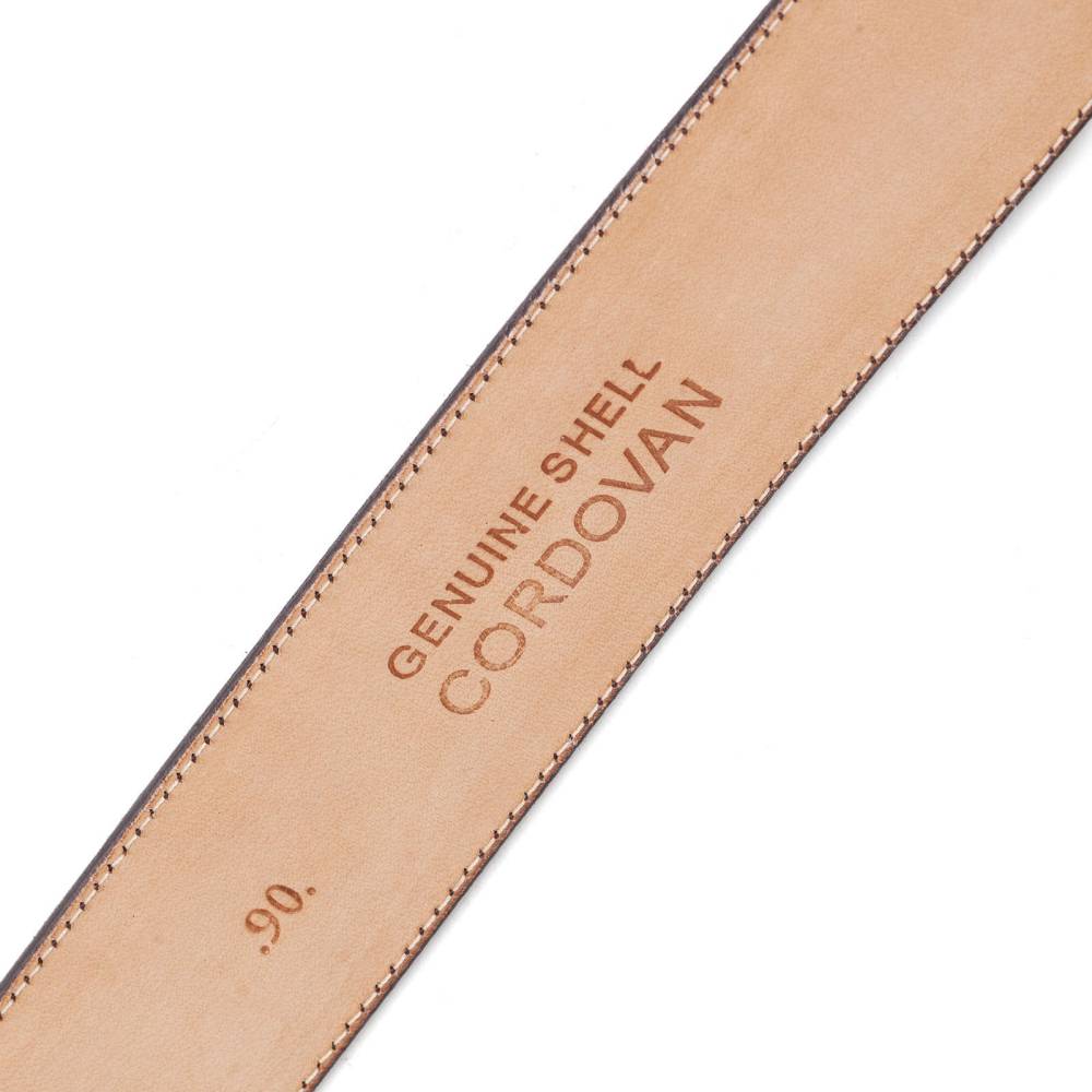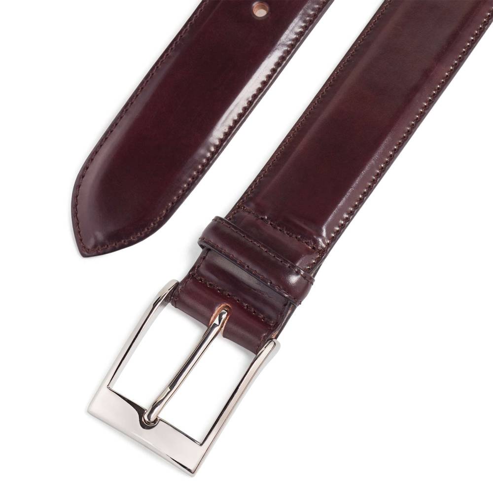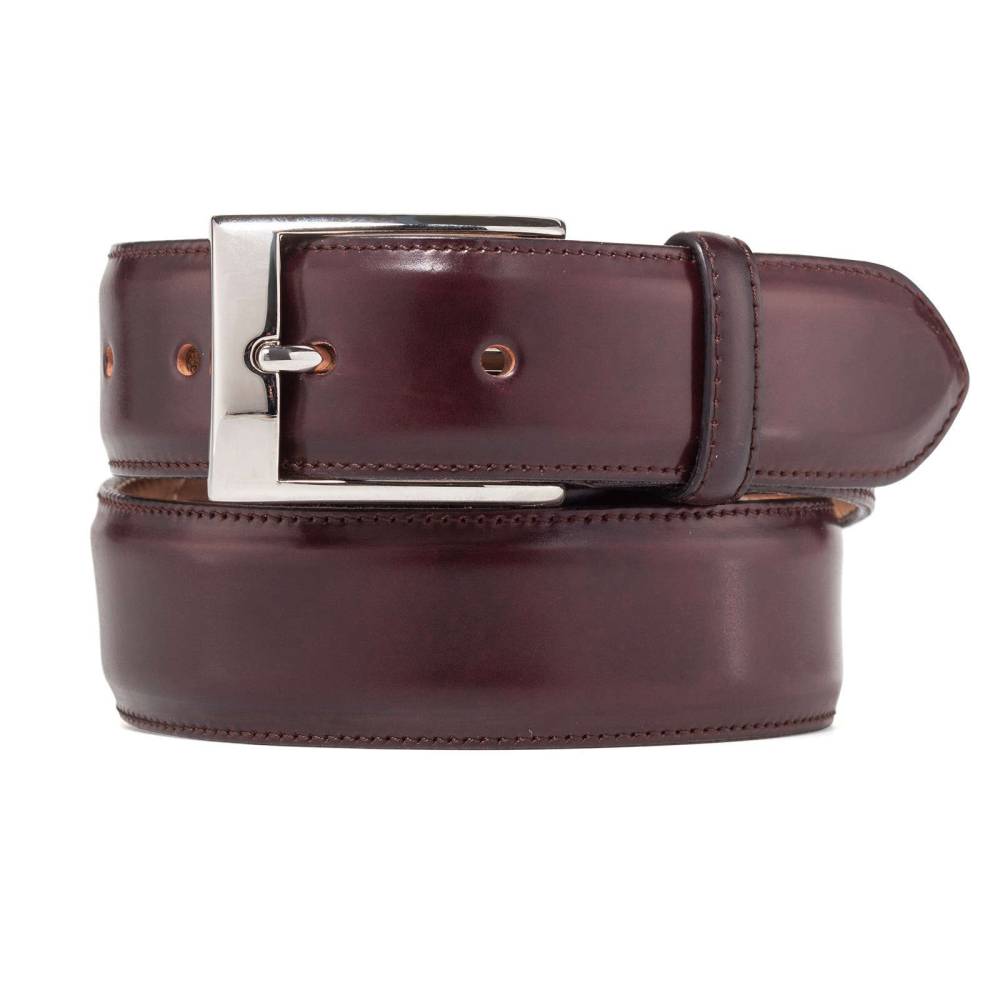 Классический мужской ремень немецкой фирмы Kreis Ledermanufaktur полностью выполнен вручную из трех отрезков лошадиной кожи Horween Shell Cordovan. Полотно ремня вручную окрашено в бордовый цвет, известный во всем мире под маркировкой oxblood 08. Пряжка выполнена из никелированной латуни.
