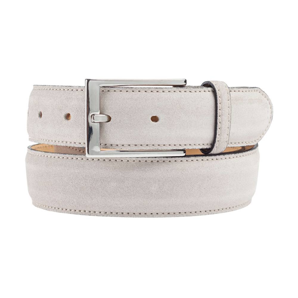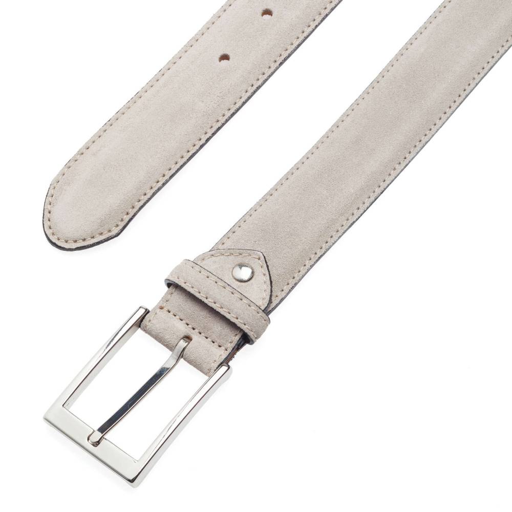 Классический мужской ремень испанского бренда Artisan из мягкой бархатистой замши серого цвета. Модель имеет традиционную прямоугольную пряжку из никелированной латуни. К ремню прилагается фирменная коробка.