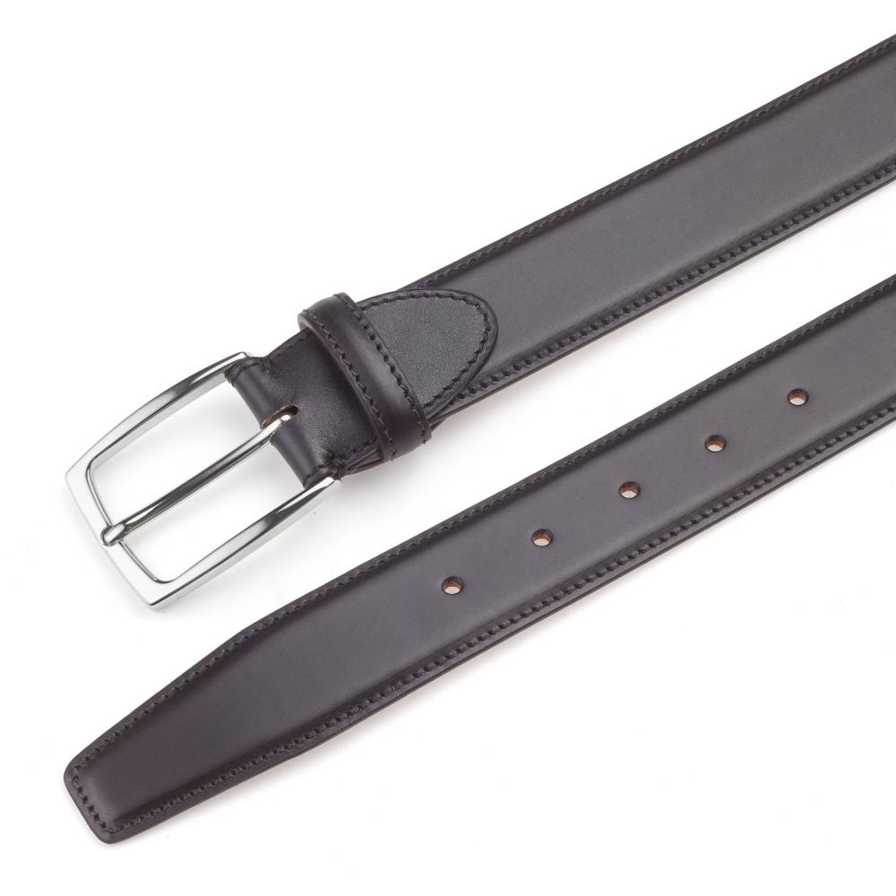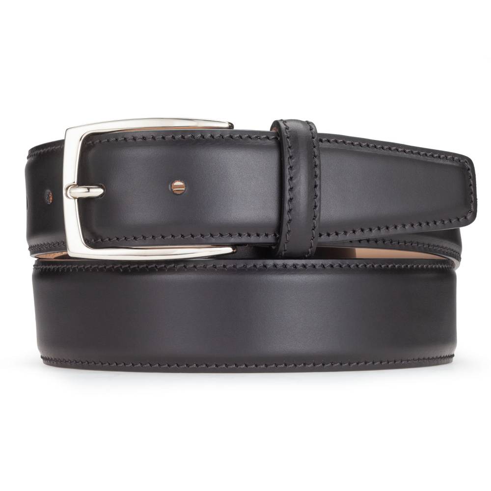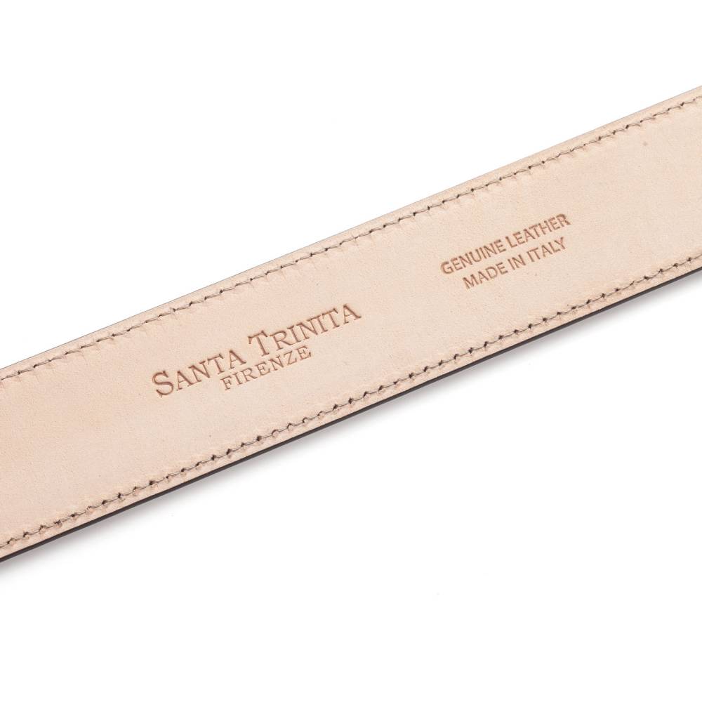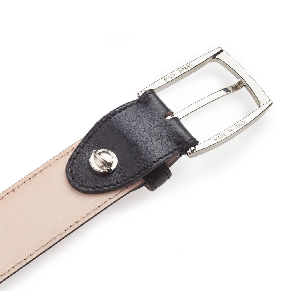 Классический мужской ремень флорентийского бренда Santa Trinita из гладкой чёрной телячьей кожи. Внутренняя часть из тонкой кожи растительного дубления. Модель имеет традиционную прямоугольную пряжку из никелированной латуни. Ремень сделан на небольшом семейном предприятии в Тоскане, знаменитом кожевенном регионе Италии.