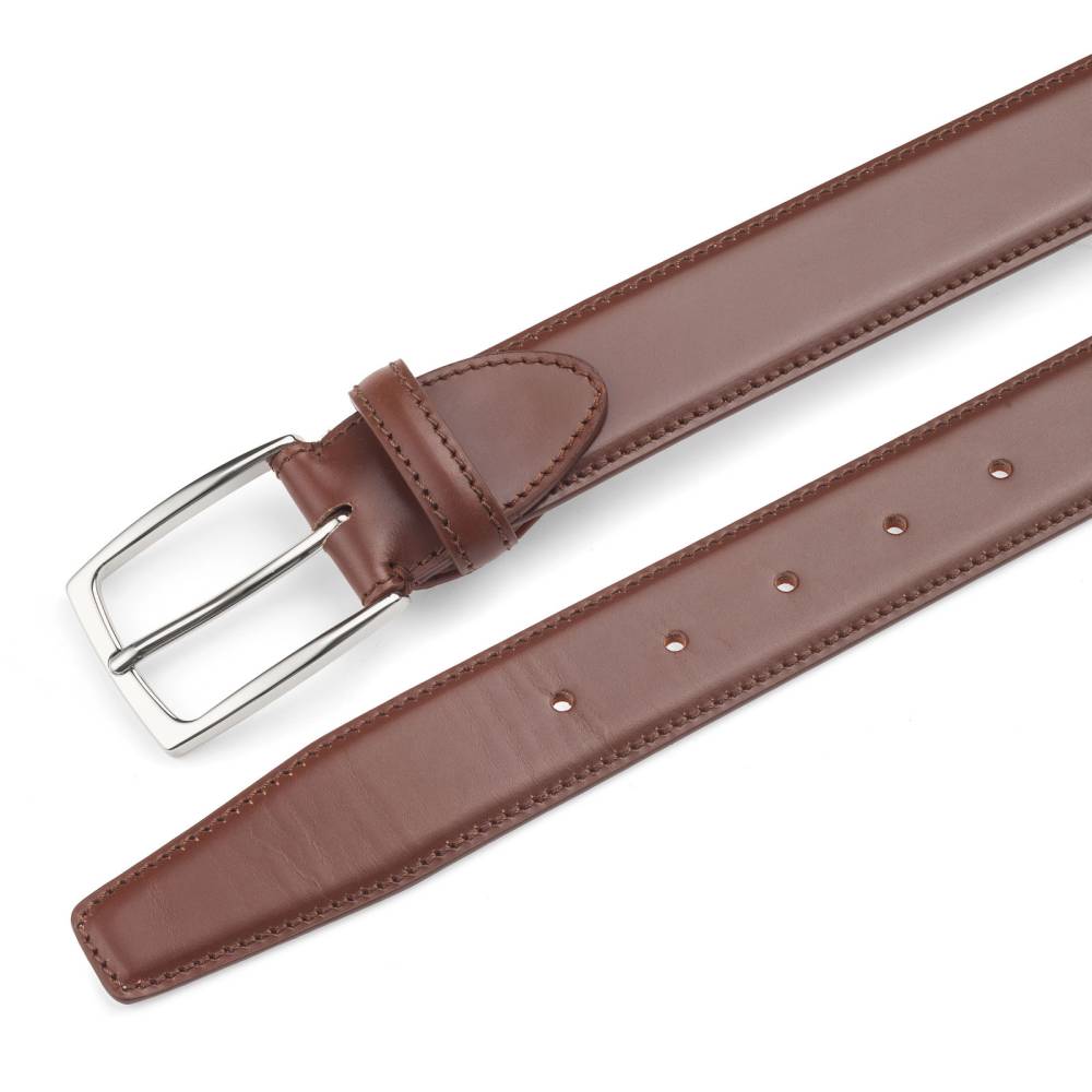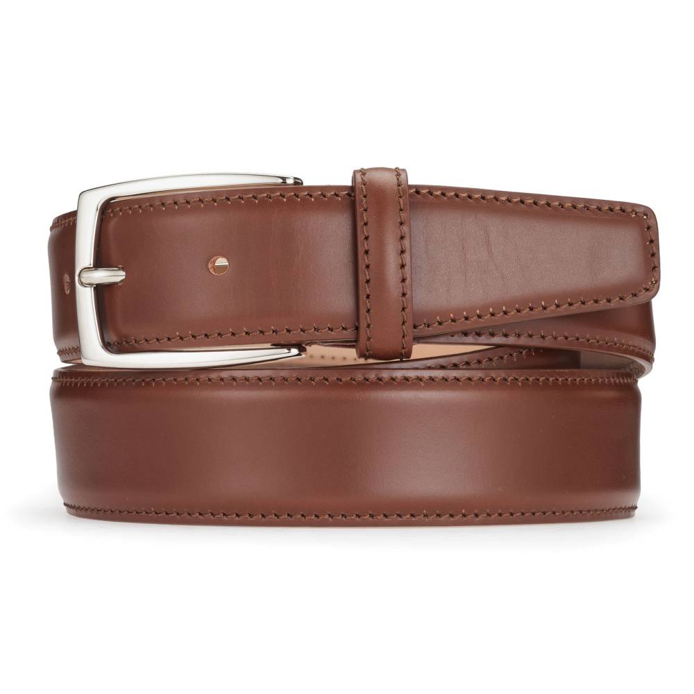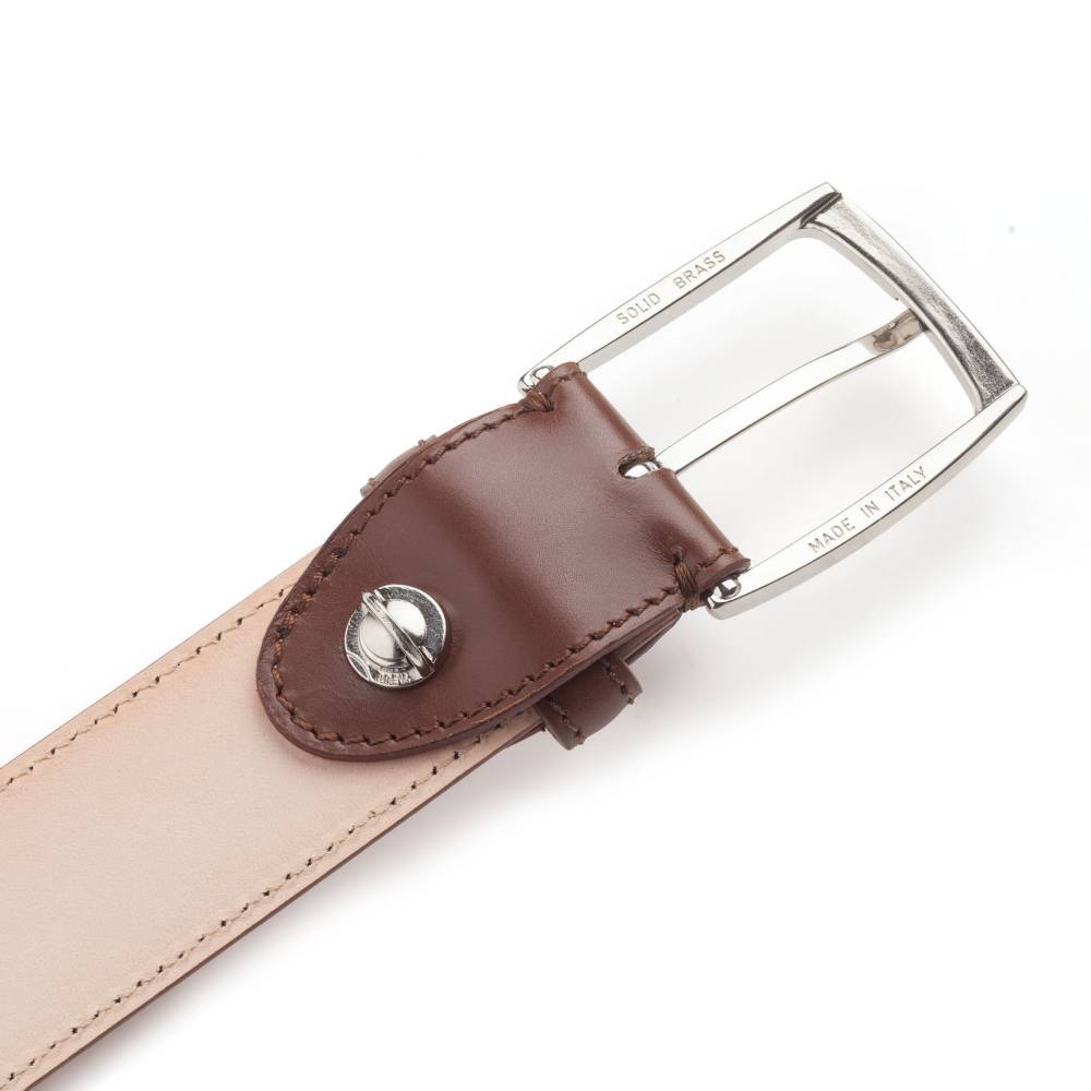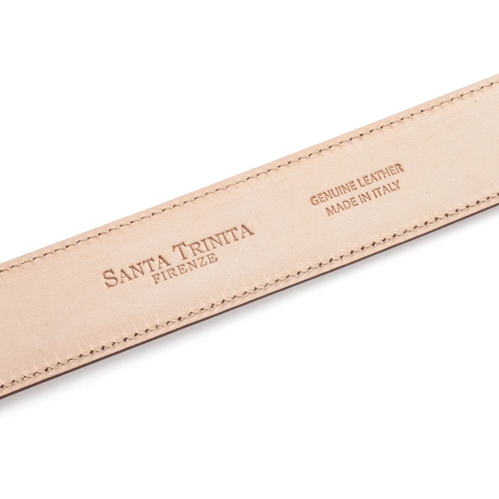 Классический мужской ремень флорентийского бренда Santa Trinita из гладкой коричневой телячьей кожи. Внутренняя часть из тонкой кожи растительного дубления. Модель имеет традиционную прямоугольную пряжку из никелированной латуни. Ремень сделан на небольшом семейном предприятии в Тоскане, знаменитом кожевенном регионе Италии.