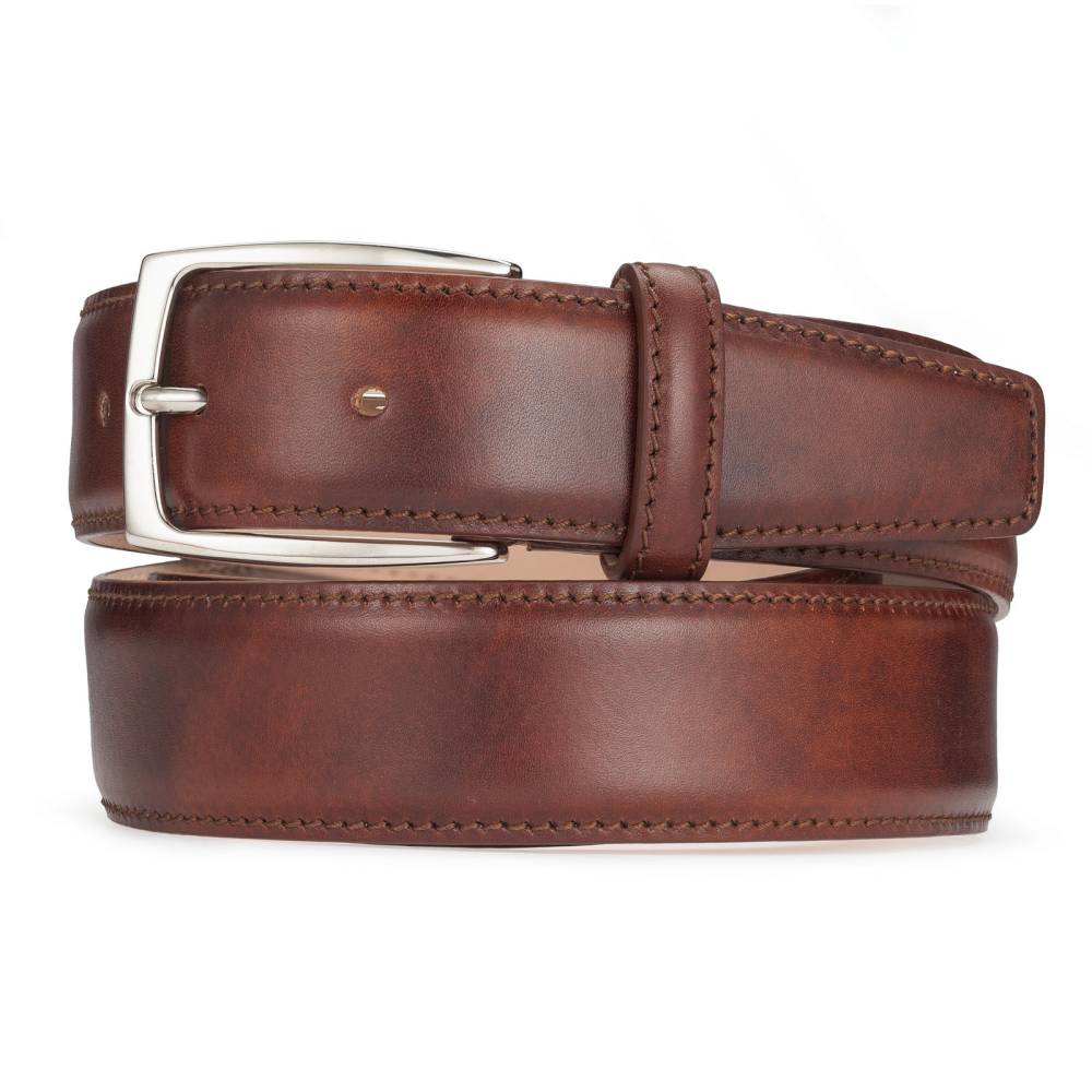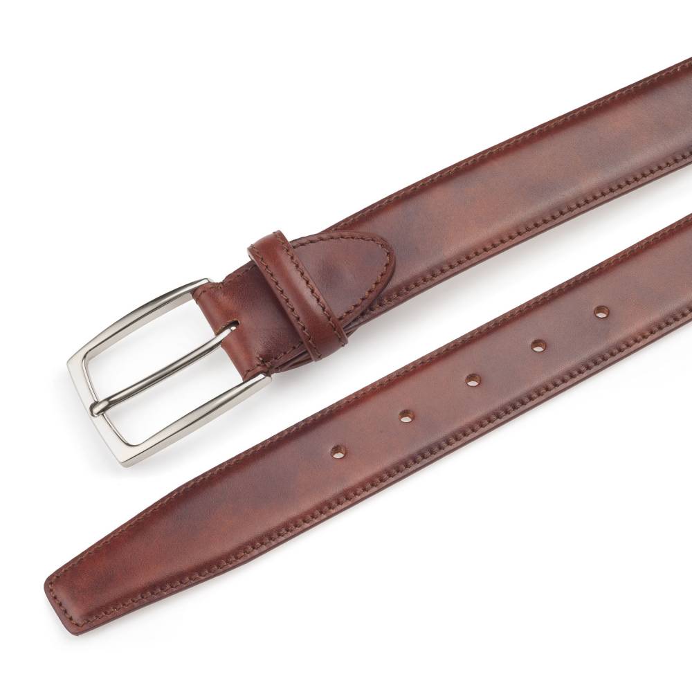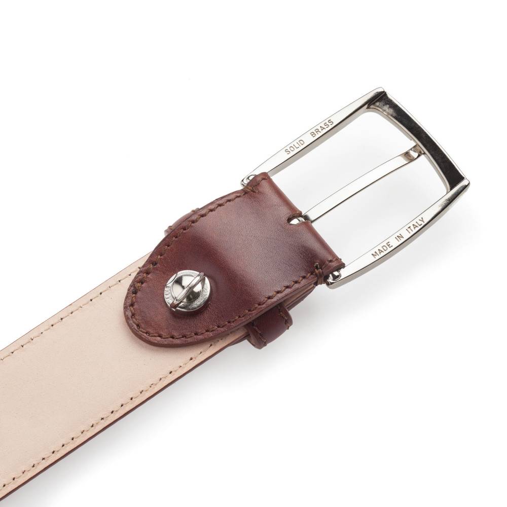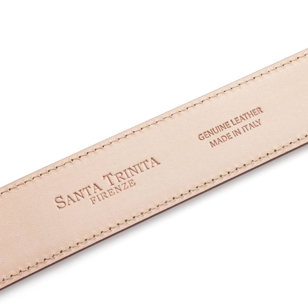 Классический мужской ремень флорентийского бренда Santa Trinita из эффектной музейной кожи коричневого цвета с характерной игрой оттенков, подобной узорам на мраморе. Внутренняя часть из тонкой кожи растительного дубления. Модель имеет традиционную прямоугольную пряжку из никелированной латуни. Ремень сделан на небольшом семейном предприятии в Тоскане, знаменитом кожевенном регионе Италии.