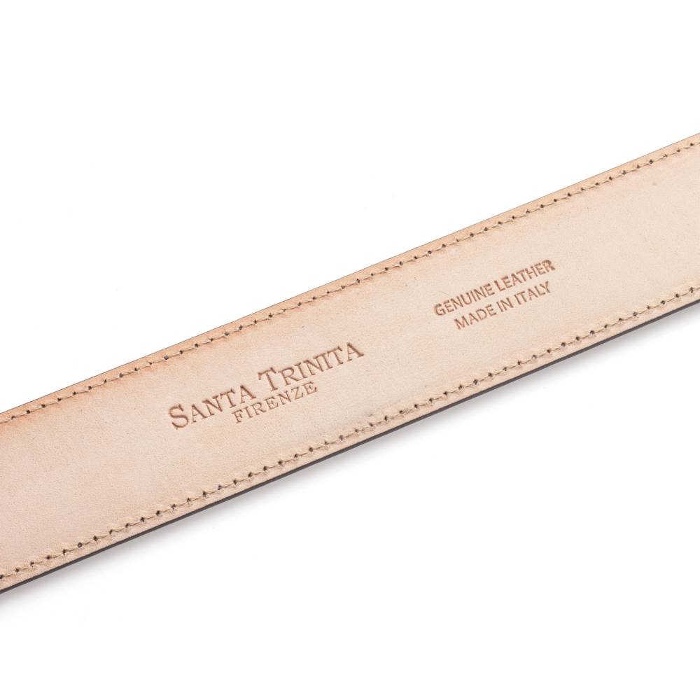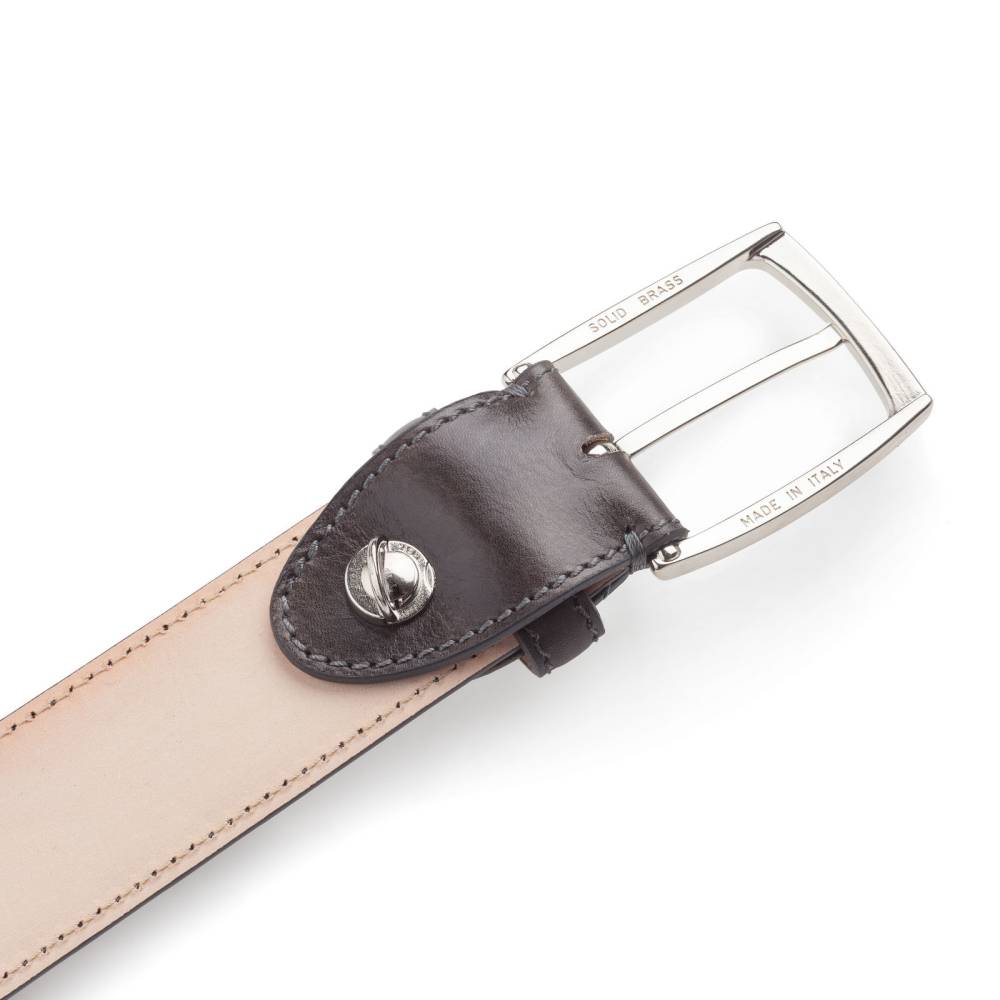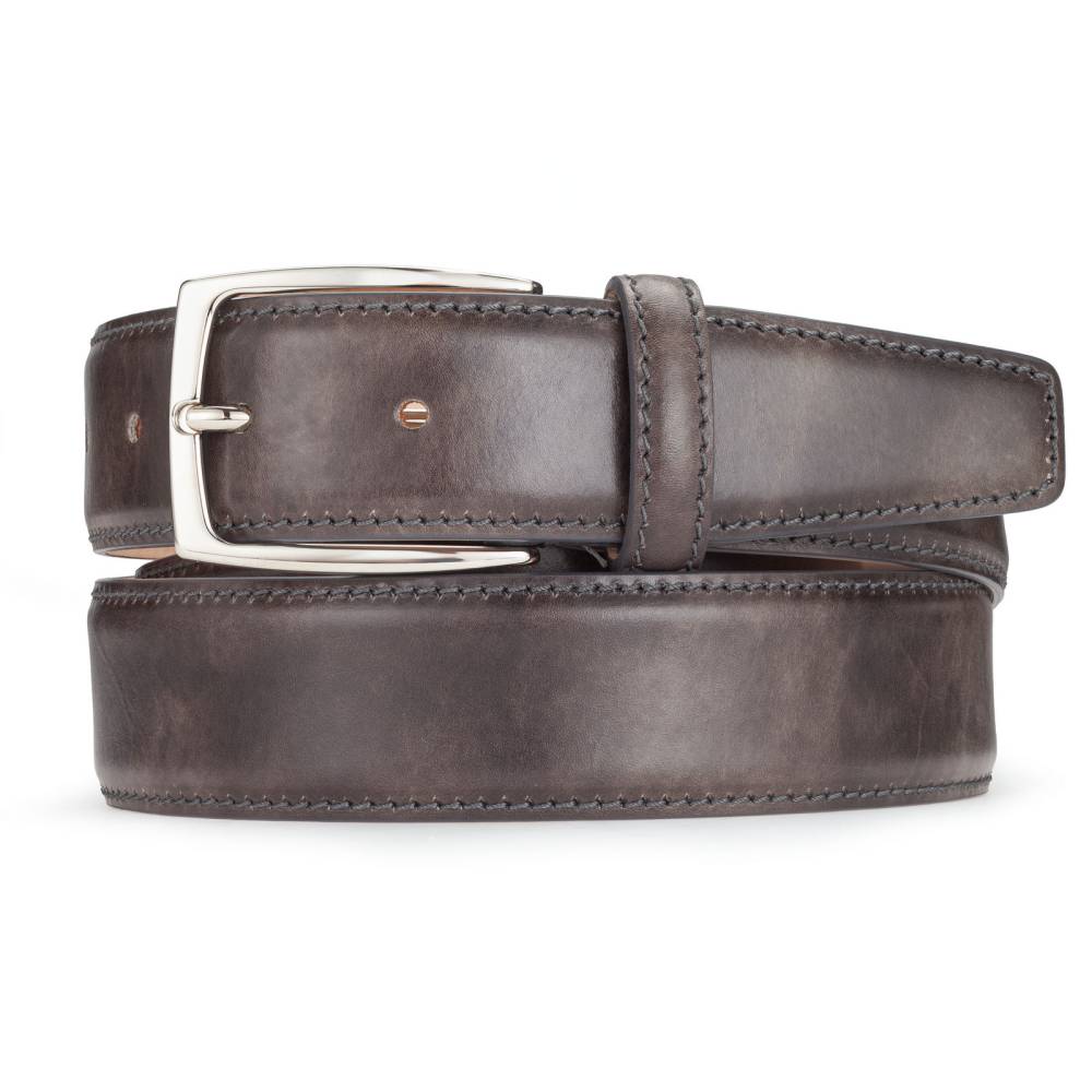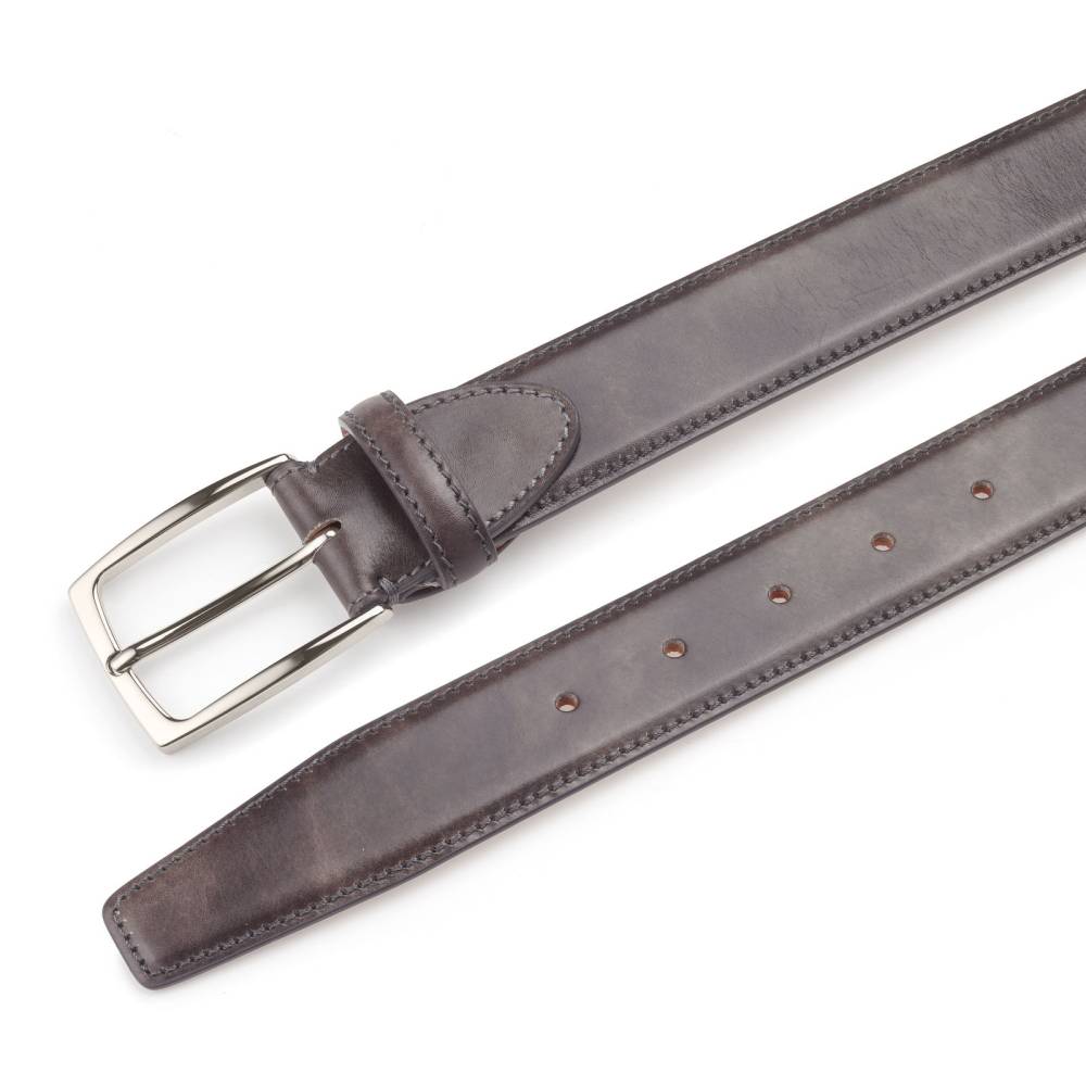 Классический мужской ремень флорентийского бренда Santa Trinita из эффектной музейной кожи серого цвета с характерной игрой оттенков, подобной узорам на мраморе. Внутренняя часть из тонкой кожи растительного дубления. Модель имеет традиционную прямоугольную пряжку из никелированной латуни. Ремень сделан на небольшом семейном предприятии в Тоскане, знаменитом кожевенном регионе Италии.