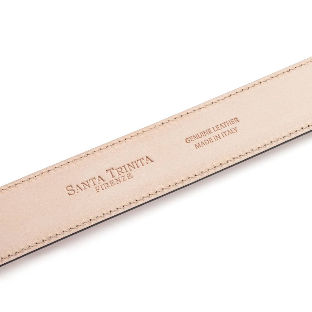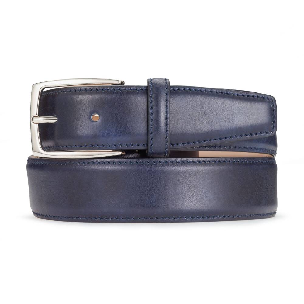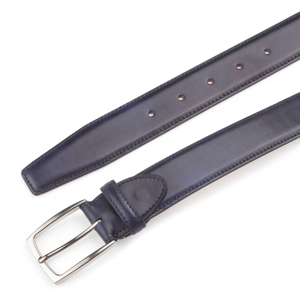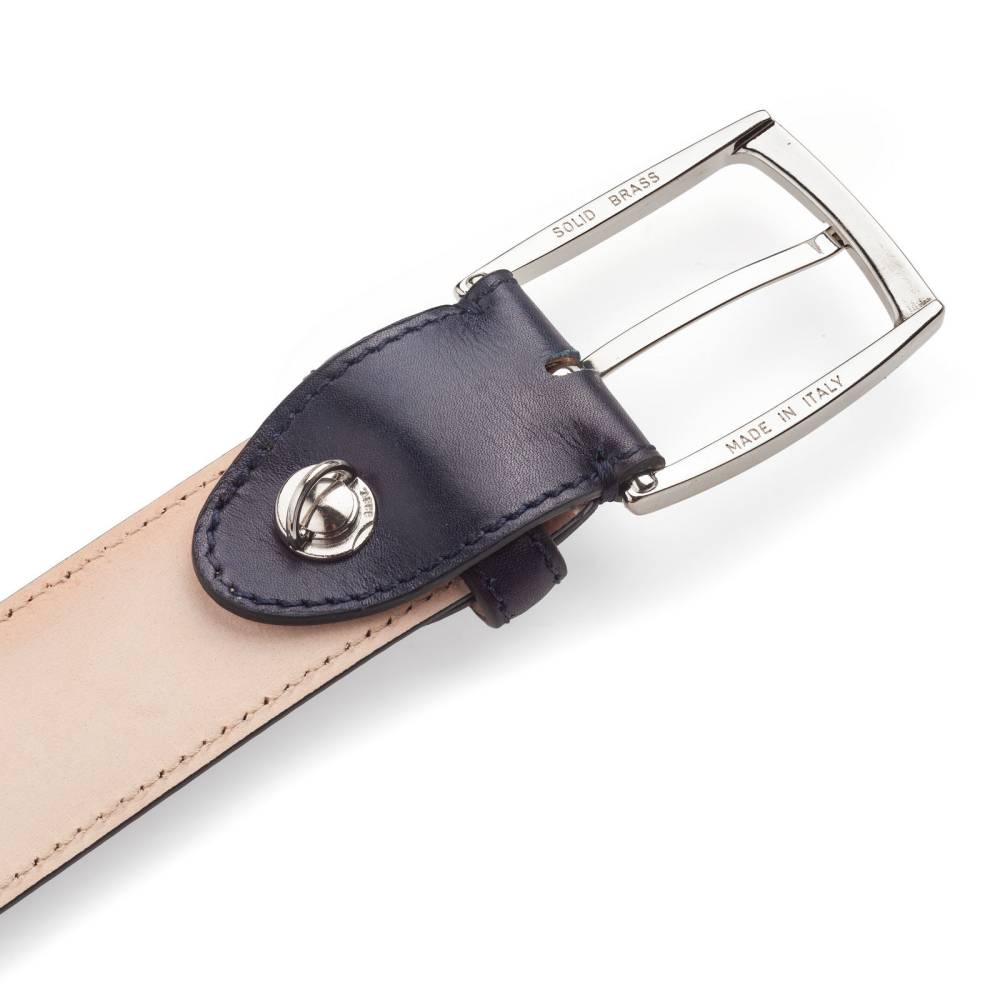 Классический мужской ремень флорентийского бренда Santa Trinita из эффектной музейной кожи тёмно-синего цвета с характерной игрой оттенков, подобной узорам на мраморе. Внутренняя часть из тонкой кожи растительного дубления. Модель имеет традиционную прямоугольную пряжку из никелированной латуни. Ремень сделан на небольшом семейном предприятии в Тоскане, знаменитом кожевенном регионе Италии.