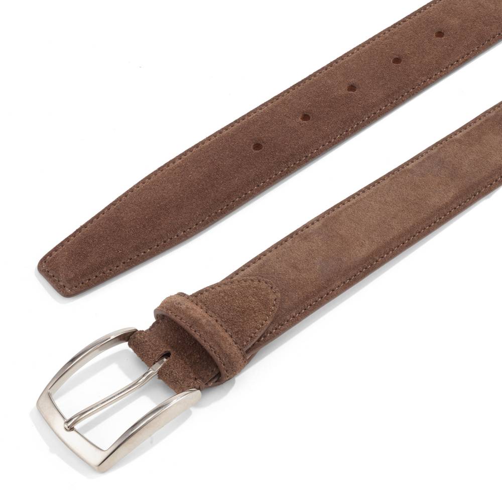 Изготовлен из натуральной замши цвета хаки на небольшом семейном предприятии в Тоскане — регионе, знаменитом своими вековыми кожевенными традициями. Внутренняя часть аксессуара выполнена из тонкой кожи растительного дубления, что обеспечивает прочность и комфорт при носке. Модель дополнена традиционной прямоугольной пряжкой из никелированной латуни. Благодаря продуманной конструкции со съёмной пряжкой, полотно ремня можно легко укоротить до нужной длины, обеспечив идеальную посадку.